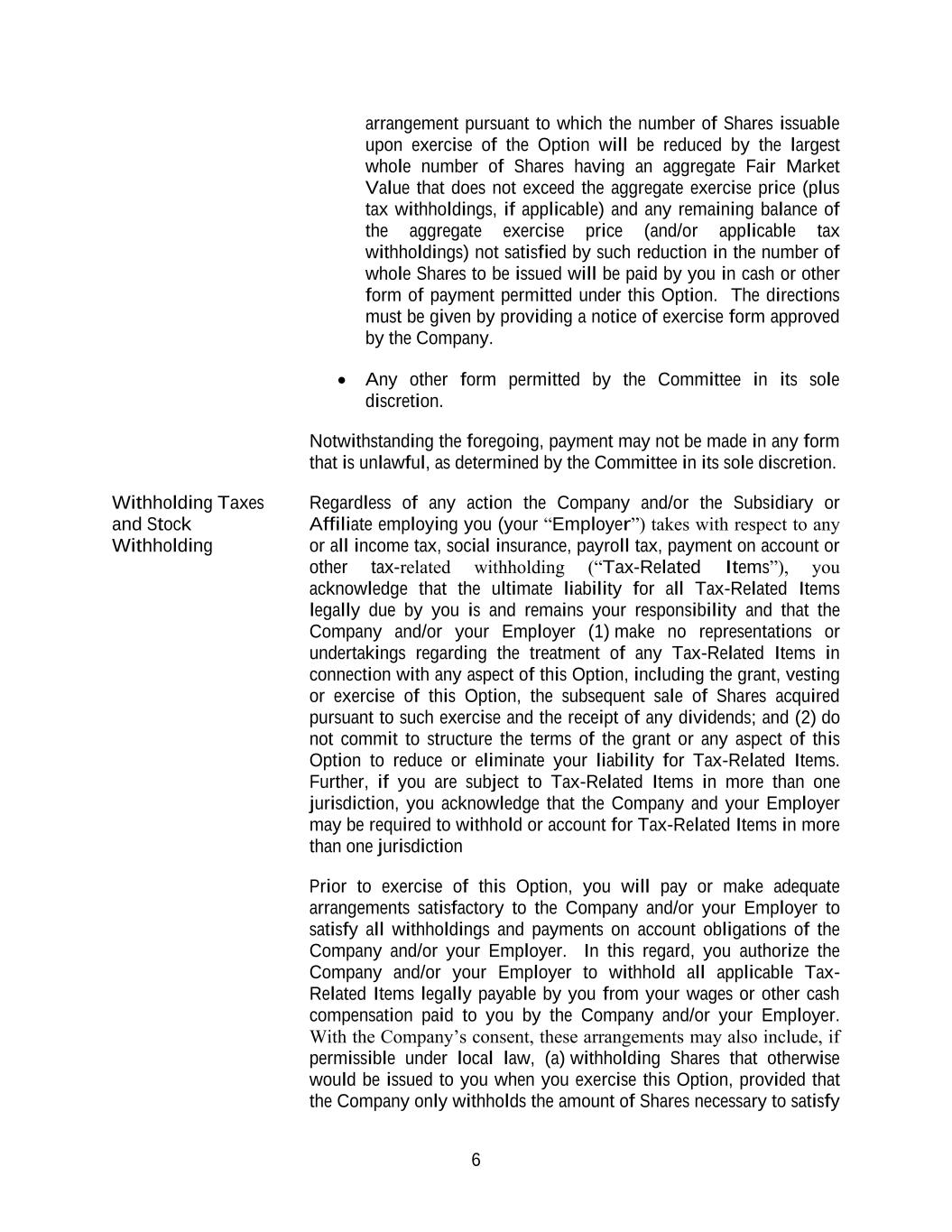 6 arrangement pursuant to which the number of Shares issuable upon exercise of the Option will be reduced by the largest whole number of Shares having an aggregate Fair Market Value that does not exceed the aggregate exercise price (plus tax withholdings, if applicable) and any remaining balance of the aggregate exercise price (and/or applicable tax withholdings) not satisfied by such reduction in the number of whole Shares to be issued will be paid by you in cash or other form of payment permitted under this Option. The directions must be given by providing a notice of exercise form approved by the Company. • Any other form permitted by the Committee in its sole discretion. Notwithstanding the foregoing, payment may not be made in any form that is unlawful, as determined by the Committee in its sole discretion. Withholding Taxes and Stock Withholding Regardless of any action the Company and/or the Subsidiary or Affiliate employing you (your “Employer”) takes with respect to any or all income tax, social insurance, payroll tax, payment on account or other tax-related withholding (“Tax-Related Items”), you acknowledge that the ultimate liability for all Tax-Related Items legally due by you is and remains your responsibility and that the Company and/or your Employer (1) make no representations or undertakings regarding the treatment of any Tax-Related Items in connection with any aspect of this Option, including the grant, vesting or exercise of this Option, the subsequent sale of Shares acquired pursuant to such exercise and the receipt of any dividends; and (2) do not commit to structure the terms of the grant or any aspect of this Option to reduce or eliminate your liability for Tax-Related Items. Further, if you are subject to Tax-Related Items in more than one jurisdiction, you acknowledge that the Company and your Employer may be required to withhold or account for Tax-Related Items in more than one jurisdiction Prior to exercise of this Option, you will pay or make adequate arrangements satisfactory to the Company and/or your Employer to satisfy all withholdings and payments on account obligations of the Company and/or your Employer. In this regard, you authorize the Company and/or your Employer to withhold all applicable Tax- Related Items legally payable by you from your wages or other cash compensation paid to you by the Company and/or your Employer. With the Company’s consent, these arrangements may also include, if permissible under local law, (a) withholding Shares that otherwise would be issued to you when you exercise this Option, provided that the Company only withholds the amount of Shares necessary to satisfy