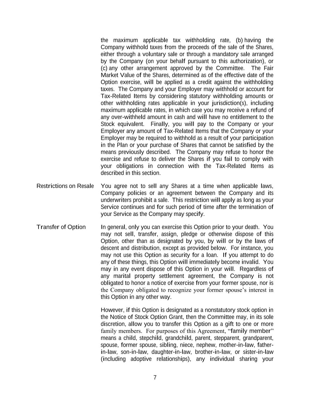 7 the maximum applicable tax withholding rate, (b) having the Company withhold taxes from the proceeds of the sale of the Shares, either through a voluntary sale or through a mandatory sale arranged by the Company (on your behalf pursuant to this authorization), or (c) any other arrangement approved by the Committee. The Fair Market Value of the Shares, determined as of the effective date of the Option exercise, will be applied as a credit against the withholding taxes. The Company and your Employer may withhold or account for Tax-Related Items by considering statutory withholding amounts or other withholding rates applicable in your jurisdiction(s), including maximum applicable rates, in which case you may receive a refund of any over-withheld amount in cash and will have no entitlement to the Stock equivalent. Finally, you will pay to the Company or your Employer any amount of Tax-Related Items that the Company or your Employer may be required to withhold as a result of your participation in the Plan or your purchase of Shares that cannot be satisfied by the means previously described. The Company may refuse to honor the exercise and refuse to deliver the Shares if you fail to comply with your obligations in connection with the Tax-Related Items as described in this section. Restrictions on Resale You agree not to sell any Shares at a time when applicable laws, Company policies or an agreement between the Company and its underwriters prohibit a sale. This restriction will apply as long as your Service continues and for such period of time after the termination of your Service as the Company may specify. Transfer of Option In general, only you can exercise this Option prior to your death. You may not sell, transfer, assign, pledge or otherwise dispose of this Option, other than as designated by you, by will or by the laws of descent and distribution, except as provided below. For instance, you may not use this Option as security for a loan. If you attempt to do any of these things, this Option will immediately become invalid. You may in any event dispose of this Option in your will. Regardless of any marital property settlement agreement, the Company is not obligated to honor a notice of exercise from your former spouse, nor is the Company obligated to recognize your former spouse’s interest in this Option in any other way. However, if this Option is designated as a nonstatutory stock option in the Notice of Stock Option Grant, then the Committee may, in its sole discretion, allow you to transfer this Option as a gift to one or more family members. For purposes of this Agreement, “family member” means a child, stepchild, grandchild, parent, stepparent, grandparent, spouse, former spouse, sibling, niece, nephew, mother-in-law, father- in-law, son-in-law, daughter-in-law, brother-in-law, or sister-in-law (including adoptive relationships), any individual sharing your