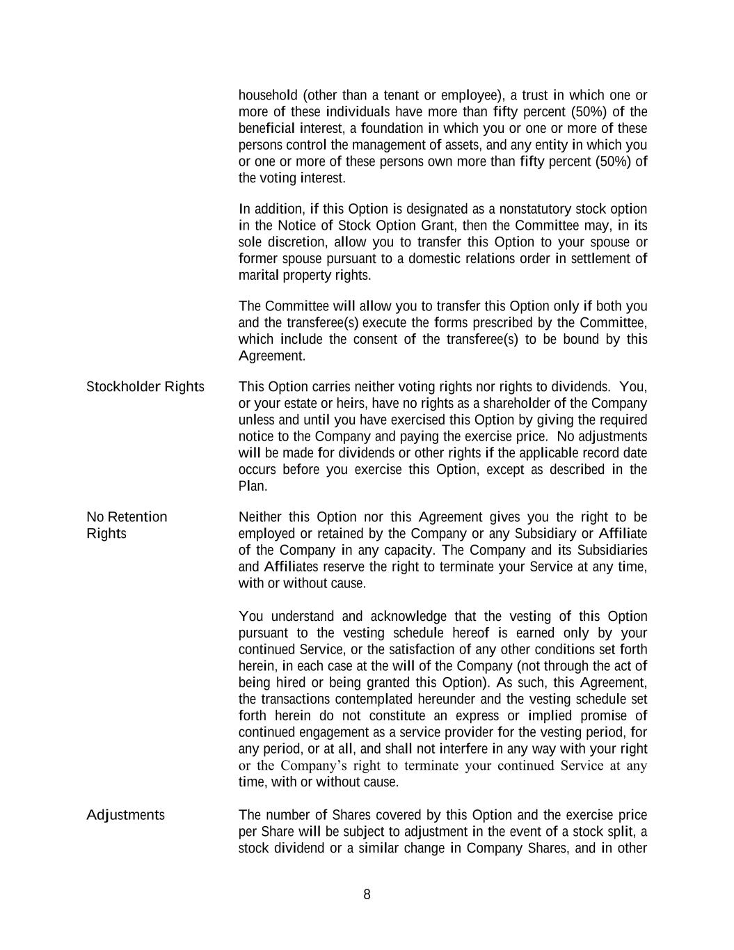 8 household (other than a tenant or employee), a trust in which one or more of these individuals have more than fifty percent (50%) of the beneficial interest, a foundation in which you or one or more of these persons control the management of assets, and any entity in which you or one or more of these persons own more than fifty percent (50%) of the voting interest. In addition, if this Option is designated as a nonstatutory stock option in the Notice of Stock Option Grant, then the Committee may, in its sole discretion, allow you to transfer this Option to your spouse or former spouse pursuant to a domestic relations order in settlement of marital property rights. The Committee will allow you to transfer this Option only if both you and the transferee(s) execute the forms prescribed by the Committee, which include the consent of the transferee(s) to be bound by this Agreement. Stockholder Rights This Option carries neither voting rights nor rights to dividends. You, or your estate or heirs, have no rights as a shareholder of the Company unless and until you have exercised this Option by giving the required notice to the Company and paying the exercise price. No adjustments will be made for dividends or other rights if the applicable record date occurs before you exercise this Option, except as described in the Plan. No Retention Rights Neither this Option nor this Agreement gives you the right to be employed or retained by the Company or any Subsidiary or Affiliate of the Company in any capacity. The Company and its Subsidiaries and Affiliates reserve the right to terminate your Service at any time, with or without cause. You understand and acknowledge that the vesting of this Option pursuant to the vesting schedule hereof is earned only by your continued Service, or the satisfaction of any other conditions set forth herein, in each case at the will of the Company (not through the act of being hired or being granted this Option). As such, this Agreement, the transactions contemplated hereunder and the vesting schedule set forth herein do not constitute an express or implied promise of continued engagement as a service provider for the vesting period, for any period, or at all, and shall not interfere in any way with your right or the Company’s right to terminate your continued Service at any time, with or without cause. Adjustments The number of Shares covered by this Option and the exercise price per Share will be subject to adjustment in the event of a stock split, a stock dividend or a similar change in Company Shares, and in other