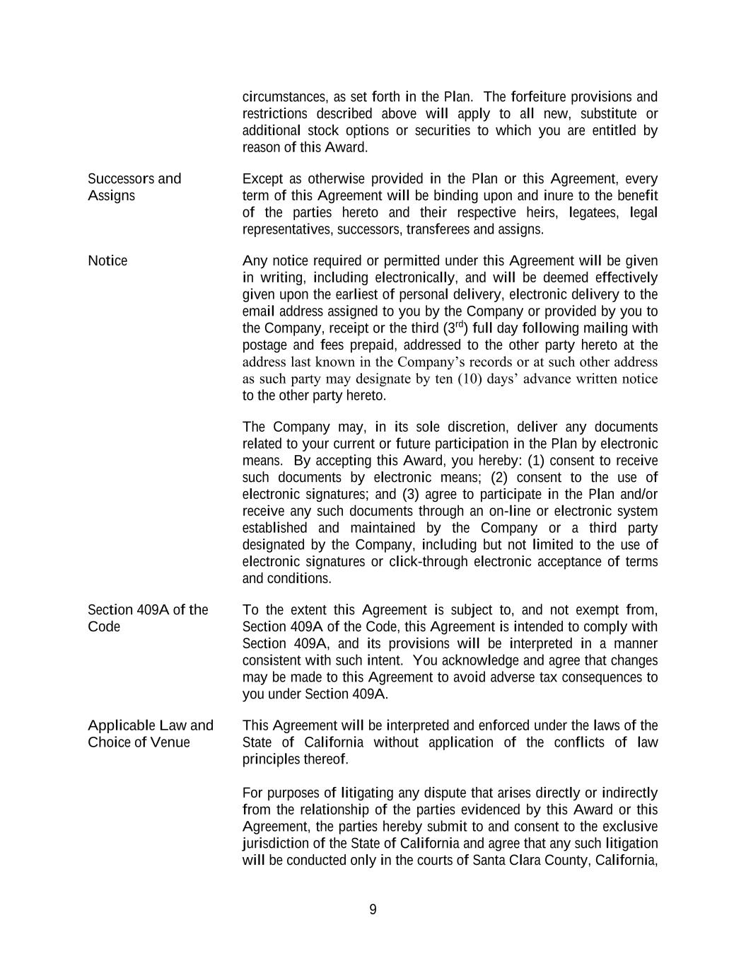 9 circumstances, as set forth in the Plan. The forfeiture provisions and restrictions described above will apply to all new, substitute or additional stock options or securities to which you are entitled by reason of this Award. Successors and Assigns Except as otherwise provided in the Plan or this Agreement, every term of this Agreement will be binding upon and inure to the benefit of the parties hereto and their respective heirs, legatees, legal representatives, successors, transferees and assigns. Notice Any notice required or permitted under this Agreement will be given in writing, including electronically, and will be deemed effectively given upon the earliest of personal delivery, electronic delivery to the email address assigned to you by the Company or provided by you to the Company, receipt or the third (3rd) full day following mailing with postage and fees prepaid, addressed to the other party hereto at the address last known in the Company’s records or at such other address as such party may designate by ten (10) days’ advance written notice to the other party hereto. The Company may, in its sole discretion, deliver any documents related to your current or future participation in the Plan by electronic means. By accepting this Award, you hereby: (1) consent to receive such documents by electronic means; (2) consent to the use of electronic signatures; and (3) agree to participate in the Plan and/or receive any such documents through an on-line or electronic system established and maintained by the Company or a third party designated by the Company, including but not limited to the use of electronic signatures or click-through electronic acceptance of terms and conditions. Section 409A of the Code To the extent this Agreement is subject to, and not exempt from, Section 409A of the Code, this Agreement is intended to comply with Section 409A, and its provisions will be interpreted in a manner consistent with such intent. You acknowledge and agree that changes may be made to this Agreement to avoid adverse tax consequences to you under Section 409A. Applicable Law and Choice of Venue This Agreement will be interpreted and enforced under the laws of the State of California without application of the conflicts of law principles thereof. For purposes of litigating any dispute that arises directly or indirectly from the relationship of the parties evidenced by this Award or this Agreement, the parties hereby submit to and consent to the exclusive jurisdiction of the State of California and agree that any such litigation will be conducted only in the courts of Santa Clara County, California,