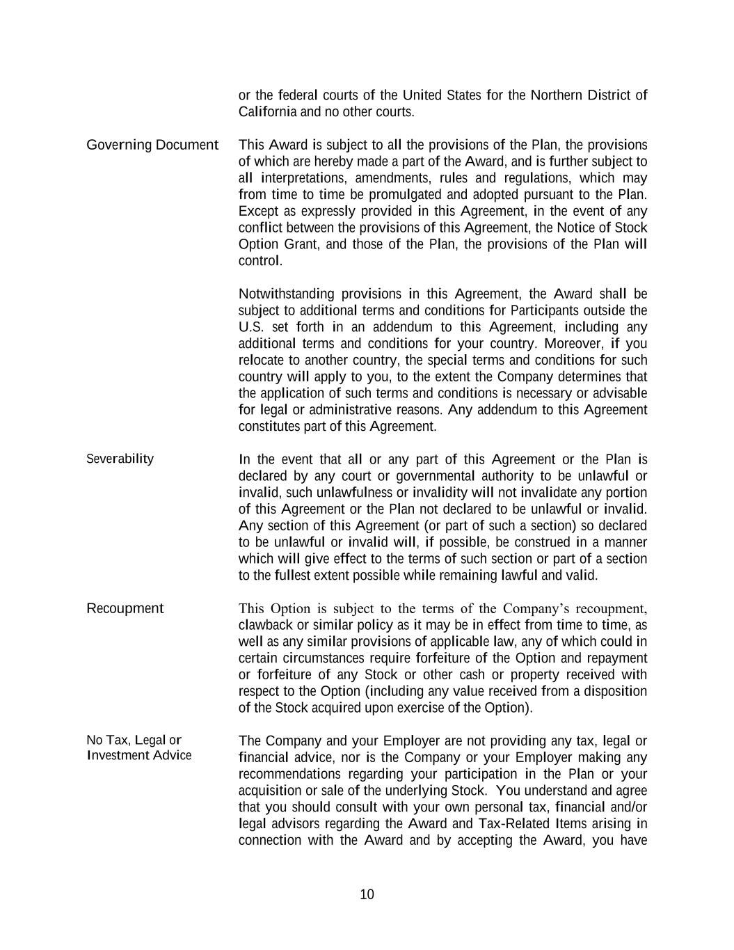 10 or the federal courts of the United States for the Northern District of California and no other courts. Governing Document This Award is subject to all the provisions of the Plan, the provisions of which are hereby made a part of the Award, and is further subject to all interpretations, amendments, rules and regulations, which may from time to time be promulgated and adopted pursuant to the Plan. Except as expressly provided in this Agreement, in the event of any conflict between the provisions of this Agreement, the Notice of Stock Option Grant, and those of the Plan, the provisions of the Plan will control. Notwithstanding provisions in this Agreement, the Award shall be subject to additional terms and conditions for Participants outside the U.S. set forth in an addendum to this Agreement, including any additional terms and conditions for your country. Moreover, if you relocate to another country, the special terms and conditions for such country will apply to you, to the extent the Company determines that the application of such terms and conditions is necessary or advisable for legal or administrative reasons. Any addendum to this Agreement constitutes part of this Agreement. Severability In the event that all or any part of this Agreement or the Plan is declared by any court or governmental authority to be unlawful or invalid, such unlawfulness or invalidity will not invalidate any portion of this Agreement or the Plan not declared to be unlawful or invalid. Any section of this Agreement (or part of such a section) so declared to be unlawful or invalid will, if possible, be construed in a manner which will give effect to the terms of such section or part of a section to the fullest extent possible while remaining lawful and valid. Recoupment This Option is subject to the terms of the Company’s recoupment, clawback or similar policy as it may be in effect from time to time, as well as any similar provisions of applicable law, any of which could in certain circumstances require forfeiture of the Option and repayment or forfeiture of any Stock or other cash or property received with respect to the Option (including any value received from a disposition of the Stock acquired upon exercise of the Option). No Tax, Legal or Investment Advice The Company and your Employer are not providing any tax, legal or financial advice, nor is the Company or your Employer making any recommendations regarding your participation in the Plan or your acquisition or sale of the underlying Stock. You understand and agree that you should consult with your own personal tax, financial and/or legal advisors regarding the Award and Tax-Related Items arising in connection with the Award and by accepting the Award, you have