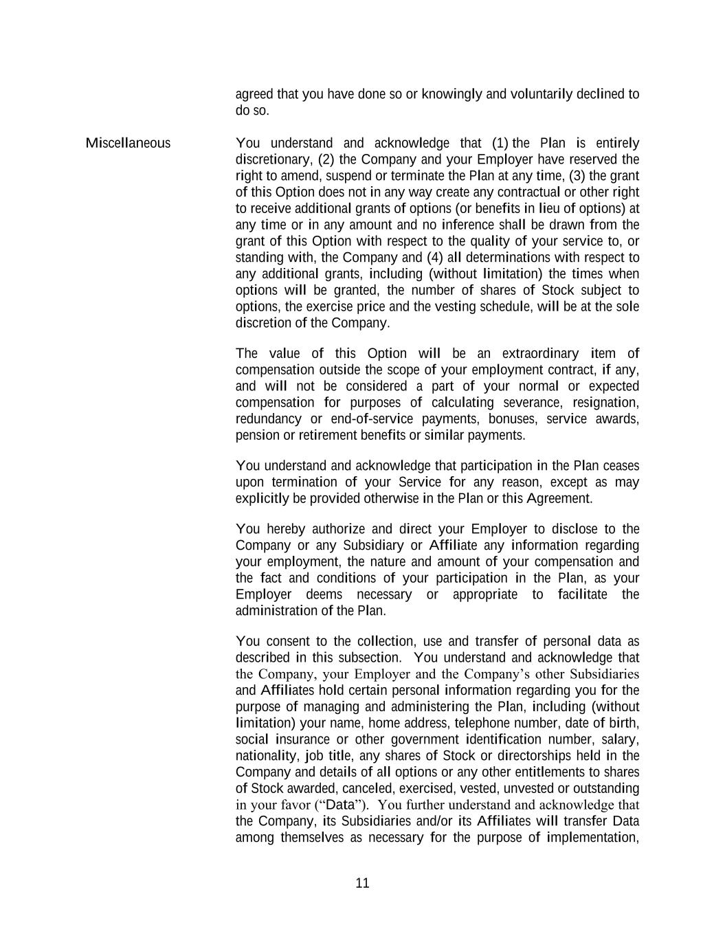 11 agreed that you have done so or knowingly and voluntarily declined to do so. Miscellaneous You understand and acknowledge that (1) the Plan is entirely discretionary, (2) the Company and your Employer have reserved the right to amend, suspend or terminate the Plan at any time, (3) the grant of this Option does not in any way create any contractual or other right to receive additional grants of options (or benefits in lieu of options) at any time or in any amount and no inference shall be drawn from the grant of this Option with respect to the quality of your service to, or standing with, the Company and (4) all determinations with respect to any additional grants, including (without limitation) the times when options will be granted, the number of shares of Stock subject to options, the exercise price and the vesting schedule, will be at the sole discretion of the Company. The value of this Option will be an extraordinary item of compensation outside the scope of your employment contract, if any, and will not be considered a part of your normal or expected compensation for purposes of calculating severance, resignation, redundancy or end-of-service payments, bonuses, service awards, pension or retirement benefits or similar payments. You understand and acknowledge that participation in the Plan ceases upon termination of your Service for any reason, except as may explicitly be provided otherwise in the Plan or this Agreement. You hereby authorize and direct your Employer to disclose to the Company or any Subsidiary or Affiliate any information regarding your employment, the nature and amount of your compensation and the fact and conditions of your participation in the Plan, as your Employer deems necessary or appropriate to facilitate the administration of the Plan. You consent to the collection, use and transfer of personal data as described in this subsection. You understand and acknowledge that the Company, your Employer and the Company’s other Subsidiaries and Affiliates hold certain personal information regarding you for the purpose of managing and administering the Plan, including (without limitation) your name, home address, telephone number, date of birth, social insurance or other government identification number, salary, nationality, job title, any shares of Stock or directorships held in the Company and details of all options or any other entitlements to shares of Stock awarded, canceled, exercised, vested, unvested or outstanding in your favor (“Data”). You further understand and acknowledge that the Company, its Subsidiaries and/or its Affiliates will transfer Data among themselves as necessary for the purpose of implementation,