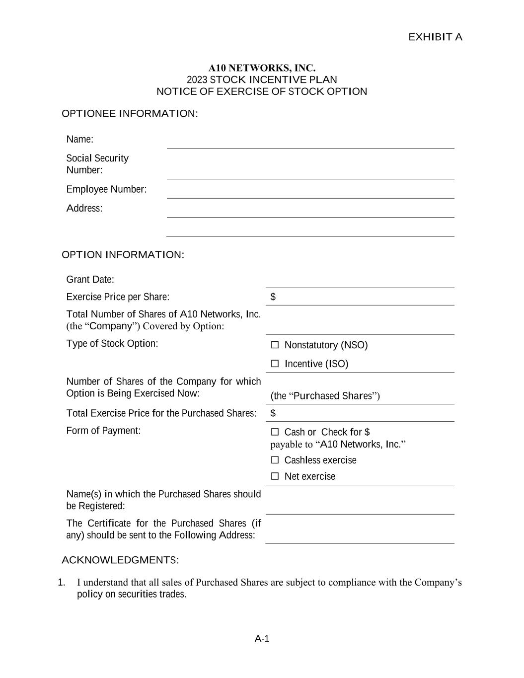 EXHIBIT A A-1 A10 NETWORKS, INC. 2023 STOCK INCENTIVE PLAN NOTICE OF EXERCISE OF STOCK OPTION OPTIONEE INFORMATION: Name: Social Security Number: Employee Number: Address: OPTION INFORMATION: Grant Date: Exercise Price per Share: $ Total Number of Shares of A10 Networks, Inc. (the “Company”) Covered by Option: Type of Stock Option: ☐ Nonstatutory (NSO) ☐ Incentive (ISO) Number of Shares of the Company for which Option is Being Exercised Now: (the “Purchased Shares”) Total Exercise Price for the Purchased Shares: $ Form of Payment: ☐ Cash or Check for $ payable to “A10 Networks, Inc.” ☐ Cashless exercise ☐ Net exercise Name(s) in which the Purchased Shares should be Registered: The Certificate for the Purchased Shares (if any) should be sent to the Following Address: ACKNOWLEDGMENTS: 1. I understand that all sales of Purchased Shares are subject to compliance with the Company’s policy on securities trades.