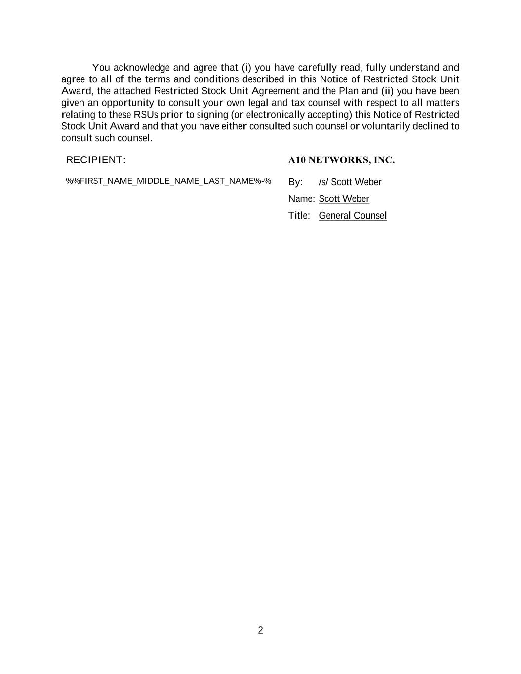 2 You acknowledge and agree that (i) you have carefully read, fully understand and agree to all of the terms and conditions described in this Notice of Restricted Stock Unit Award, the attached Restricted Stock Unit Agreement and the Plan and (ii) you have been given an opportunity to consult your own legal and tax counsel with respect to all matters relating to these RSUs prior to signing (or electronically accepting) this Notice of Restricted Stock Unit Award and that you have either consulted such counsel or voluntarily declined to consult such counsel. RECIPIENT: A10 NETWORKS, INC. %%FIRST_NAME_MIDDLE_NAME_LAST_NAME%-% By: /s/ Scott Weber Name: Scott Weber Title: General Counsel