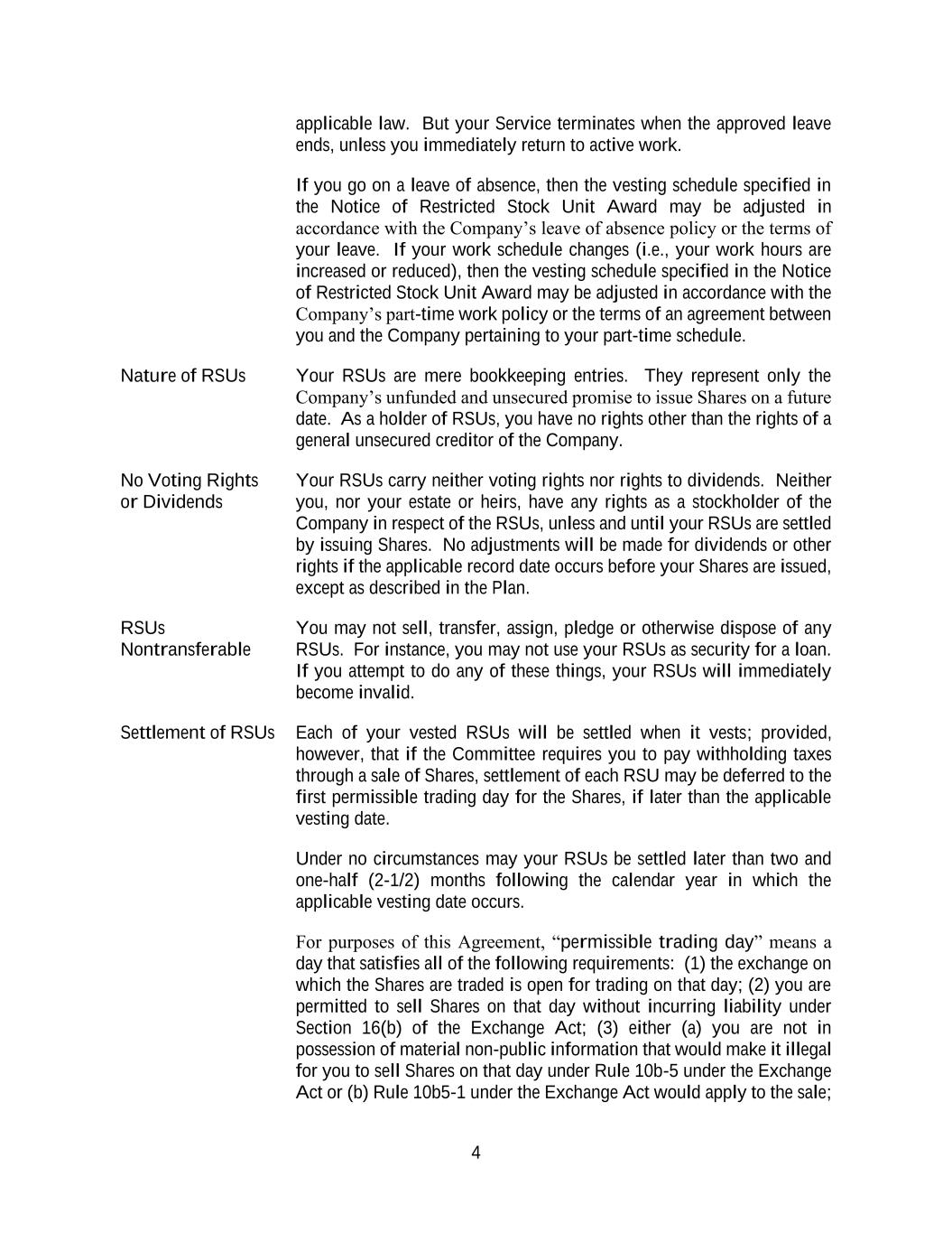 4 applicable law. But your Service terminates when the approved leave ends, unless you immediately return to active work. If you go on a leave of absence, then the vesting schedule specified in the Notice of Restricted Stock Unit Award may be adjusted in accordance with the Company’s leave of absence policy or the terms of your leave. If your work schedule changes (i.e., your work hours are increased or reduced), then the vesting schedule specified in the Notice of Restricted Stock Unit Award may be adjusted in accordance with the Company’s part-time work policy or the terms of an agreement between you and the Company pertaining to your part-time schedule. Nature of RSUs Your RSUs are mere bookkeeping entries. They represent only the Company’s unfunded and unsecured promise to issue Shares on a future date. As a holder of RSUs, you have no rights other than the rights of a general unsecured creditor of the Company. No Voting Rights or Dividends Your RSUs carry neither voting rights nor rights to dividends. Neither you, nor your estate or heirs, have any rights as a stockholder of the Company in respect of the RSUs, unless and until your RSUs are settled by issuing Shares. No adjustments will be made for dividends or other rights if the applicable record date occurs before your Shares are issued, except as described in the Plan. RSUs Nontransferable You may not sell, transfer, assign, pledge or otherwise dispose of any RSUs. For instance, you may not use your RSUs as security for a loan. If you attempt to do any of these things, your RSUs will immediately become invalid. Settlement of RSUs Each of your vested RSUs will be settled when it vests; provided, however, that if the Committee requires you to pay withholding taxes through a sale of Shares, settlement of each RSU may be deferred to the first permissible trading day for the Shares, if later than the applicable vesting date. Under no circumstances may your RSUs be settled later than two and one-half (2-1/2) months following the calendar year in which the applicable vesting date occurs. For purposes of this Agreement, “permissible trading day” means a day that satisfies all of the following requirements: (1) the exchange on which the Shares are traded is open for trading on that day; (2) you are permitted to sell Shares on that day without incurring liability under Section 16(b) of the Exchange Act; (3) either (a) you are not in possession of material non-public information that would make it illegal for you to sell Shares on that day under Rule 10b-5 under the Exchange Act or (b) Rule 10b5-1 under the Exchange Act would apply to the sale;