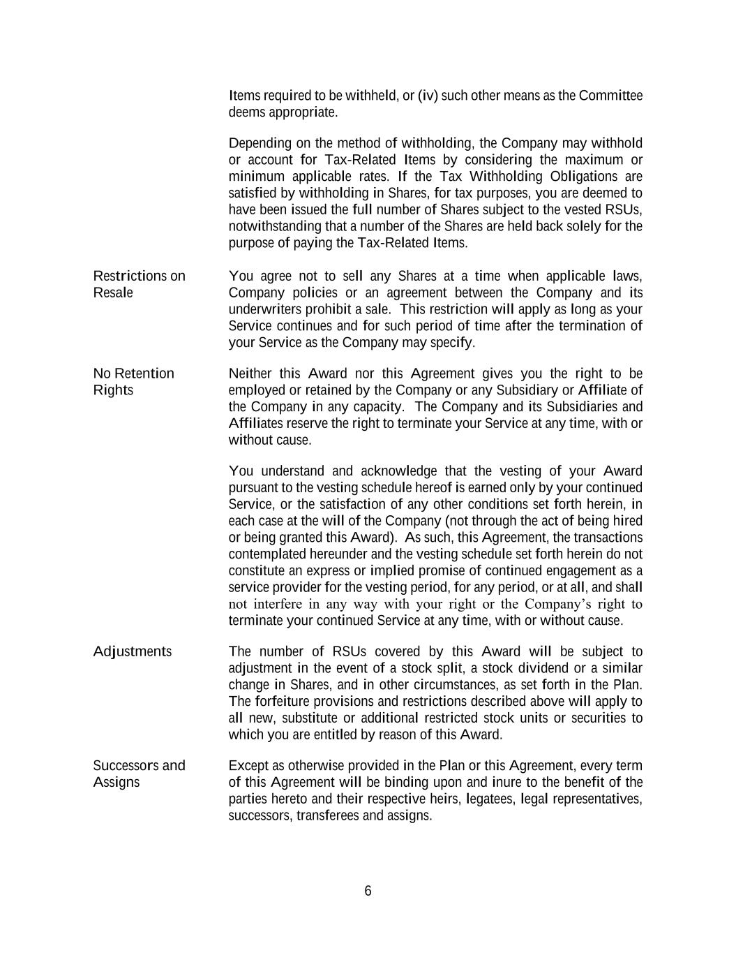 6 Items required to be withheld, or (iv) such other means as the Committee deems appropriate. Depending on the method of withholding, the Company may withhold or account for Tax-Related Items by considering the maximum or minimum applicable rates. If the Tax Withholding Obligations are satisfied by withholding in Shares, for tax purposes, you are deemed to have been issued the full number of Shares subject to the vested RSUs, notwithstanding that a number of the Shares are held back solely for the purpose of paying the Tax-Related Items. Restrictions on Resale You agree not to sell any Shares at a time when applicable laws, Company policies or an agreement between the Company and its underwriters prohibit a sale. This restriction will apply as long as your Service continues and for such period of time after the termination of your Service as the Company may specify. No Retention Rights Neither this Award nor this Agreement gives you the right to be employed or retained by the Company or any Subsidiary or Affiliate of the Company in any capacity. The Company and its Subsidiaries and Affiliates reserve the right to terminate your Service at any time, with or without cause. You understand and acknowledge that the vesting of your Award pursuant to the vesting schedule hereof is earned only by your continued Service, or the satisfaction of any other conditions set forth herein, in each case at the will of the Company (not through the act of being hired or being granted this Award). As such, this Agreement, the transactions contemplated hereunder and the vesting schedule set forth herein do not constitute an express or implied promise of continued engagement as a service provider for the vesting period, for any period, or at all, and shall not interfere in any way with your right or the Company’s right to terminate your continued Service at any time, with or without cause. Adjustments The number of RSUs covered by this Award will be subject to adjustment in the event of a stock split, a stock dividend or a similar change in Shares, and in other circumstances, as set forth in the Plan. The forfeiture provisions and restrictions described above will apply to all new, substitute or additional restricted stock units or securities to which you are entitled by reason of this Award. Successors and Assigns Except as otherwise provided in the Plan or this Agreement, every term of this Agreement will be binding upon and inure to the benefit of the parties hereto and their respective heirs, legatees, legal representatives, successors, transferees and assigns.