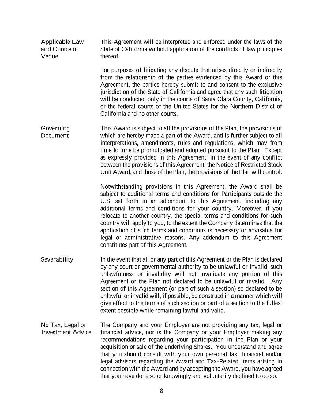 8 Applicable Law and Choice of Venue This Agreement will be interpreted and enforced under the laws of the State of California without application of the conflicts of law principles thereof. For purposes of litigating any dispute that arises directly or indirectly from the relationship of the parties evidenced by this Award or this Agreement, the parties hereby submit to and consent to the exclusive jurisdiction of the State of California and agree that any such litigation will be conducted only in the courts of Santa Clara County, California, or the federal courts of the United States for the Northern District of California and no other courts. Governing Document This Award is subject to all the provisions of the Plan, the provisions of which are hereby made a part of the Award, and is further subject to all interpretations, amendments, rules and regulations, which may from time to time be promulgated and adopted pursuant to the Plan. Except as expressly provided in this Agreement, in the event of any conflict between the provisions of this Agreement, the Notice of Restricted Stock Unit Award, and those of the Plan, the provisions of the Plan will control. Notwithstanding provisions in this Agreement, the Award shall be subject to additional terms and conditions for Participants outside the U.S. set forth in an addendum to this Agreement, including any additional terms and conditions for your country. Moreover, if you relocate to another country, the special terms and conditions for such country will apply to you, to the extent the Company determines that the application of such terms and conditions is necessary or advisable for legal or administrative reasons. Any addendum to this Agreement constitutes part of this Agreement. Severability In the event that all or any part of this Agreement or the Plan is declared by any court or governmental authority to be unlawful or invalid, such unlawfulness or invalidity will not invalidate any portion of this Agreement or the Plan not declared to be unlawful or invalid. Any section of this Agreement (or part of such a section) so declared to be unlawful or invalid will, if possible, be construed in a manner which will give effect to the terms of such section or part of a section to the fullest extent possible while remaining lawful and valid. No Tax, Legal or Investment Advice The Company and your Employer are not providing any tax, legal or financial advice, nor is the Company or your Employer making any recommendations regarding your participation in the Plan or your acquisition or sale of the underlying Shares. You understand and agree that you should consult with your own personal tax, financial and/or legal advisors regarding the Award and Tax-Related Items arising in connection with the Award and by accepting the Award, you have agreed that you have done so or knowingly and voluntarily declined to do so.