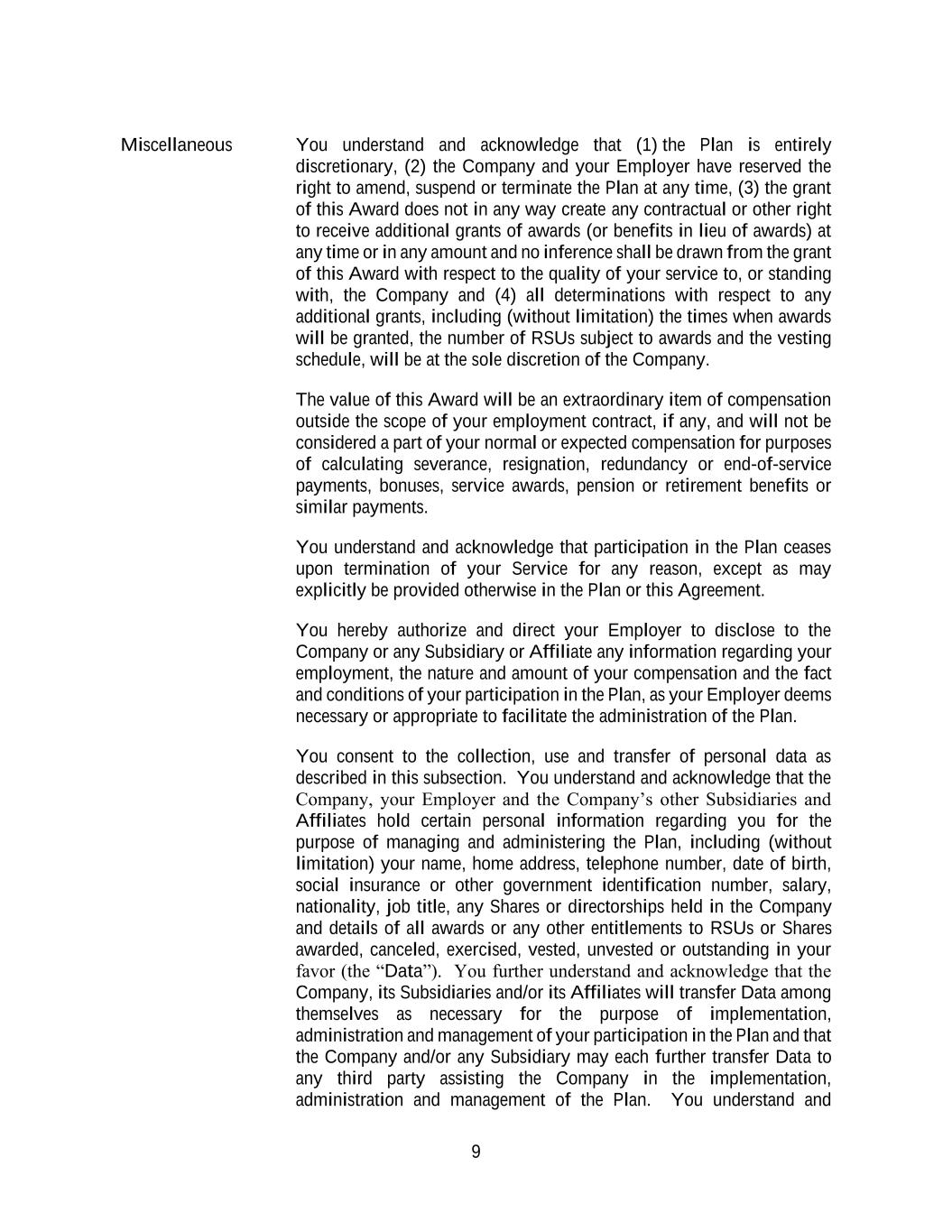 9 Miscellaneous You understand and acknowledge that (1) the Plan is entirely discretionary, (2) the Company and your Employer have reserved the right to amend, suspend or terminate the Plan at any time, (3) the grant of this Award does not in any way create any contractual or other right to receive additional grants of awards (or benefits in lieu of awards) at any time or in any amount and no inference shall be drawn from the grant of this Award with respect to the quality of your service to, or standing with, the Company and (4) all determinations with respect to any additional grants, including (without limitation) the times when awards will be granted, the number of RSUs subject to awards and the vesting schedule, will be at the sole discretion of the Company. The value of this Award will be an extraordinary item of compensation outside the scope of your employment contract, if any, and will not be considered a part of your normal or expected compensation for purposes of calculating severance, resignation, redundancy or end-of-service payments, bonuses, service awards, pension or retirement benefits or similar payments. You understand and acknowledge that participation in the Plan ceases upon termination of your Service for any reason, except as may explicitly be provided otherwise in the Plan or this Agreement. You hereby authorize and direct your Employer to disclose to the Company or any Subsidiary or Affiliate any information regarding your employment, the nature and amount of your compensation and the fact and conditions of your participation in the Plan, as your Employer deems necessary or appropriate to facilitate the administration of the Plan. You consent to the collection, use and transfer of personal data as described in this subsection. You understand and acknowledge that the Company, your Employer and the Company’s other Subsidiaries and Affiliates hold certain personal information regarding you for the purpose of managing and administering the Plan, including (without limitation) your name, home address, telephone number, date of birth, social insurance or other government identification number, salary, nationality, job title, any Shares or directorships held in the Company and details of all awards or any other entitlements to RSUs or Shares awarded, canceled, exercised, vested, unvested or outstanding in your favor (the “Data”). You further understand and acknowledge that the Company, its Subsidiaries and/or its Affiliates will transfer Data among themselves as necessary for the purpose of implementation, administration and management of your participation in the Plan and that the Company and/or any Subsidiary may each further transfer Data to any third party assisting the Company in the implementation, administration and management of the Plan. You understand and