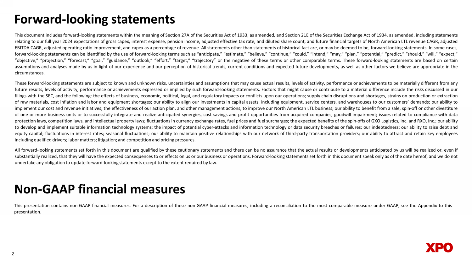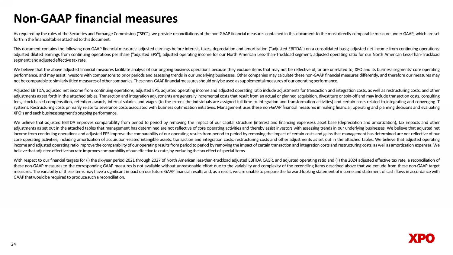 Non - GAAP financial measures As required by the rules of the Securities and Exchange Commission (“SEC”), we provide reconciliations of the non - GAAP financial measures contained in this document to the most directly comparable measure under GAAP, which are set forth in the financial tables attached to this document . This document contains the following non - GAAP financial measures : adjusted earnings before interest, taxes, depreciation and amortization (“adjusted EBITDA”) on a consolidated basis ; adjusted net income from continuing operations ; adjusted diluted earnings from continuing operations per share ("adjusted EPS") ; adjusted operating income for our North American Less - Than - Truckload segment ; adjusted operating ratio for our North American Less - Than - Truckload segment ; and adjusted effective tax rate . We believe that the above adjusted financial measures facilitate analysis of our ongoing business operations because they exclude items that may not be reflective of, or are unrelated to, XPO and its business segments’ core operating performance, and may assist investors with comparisons to prior periods and assessing trends in our underlying businesses . Other companies may calculate these non - GAAP financial measures differently, and therefore our measures may not be comparable to similarly titled measures of other companies . These non - GAAP financial measures should only be used as supplemental measures of our operating performance . Adjusted EBITDA, adjusted net income from continuing operations, adjusted EPS, adjusted operating income and adjusted operating ratio include adjustments for transaction and integration costs, as well as restructuring costs, and other adjustments as set forth in the attached tables . Transaction and integration adjustments are generally incremental costs that result from an actual or planned acquisition, divestiture or spin - off and may include transaction costs, consulting fees, stock - based compensation, retention awards, internal salaries and wages (to the extent the individuals are assigned full - time to integration and transformation activities) and certain costs related to integrating and converging IT systems . Restructuring costs primarily relate to severance costs associated with business optimization initiatives . Management uses these non - GAAP financial measures in making financial, operating and planning decisions and evaluating XPO’s and each business segment’s ongoing performance . We believe that adjusted EBITDA improves comparability from period to period by removing the impact of our capital structure (interest and financing expenses), asset base (depreciation and amortization), tax impacts and other adjustments as set out in the attached tables that management has determined are not reflective of core operating activities and thereby assist investors with assessing trends in our underlying businesses . We believe that adjusted net income from continuing operations and adjusted EPS improve the comparability of our operating results from period to period by removing the impact of certain costs and gains that management has determined are not reflective of our core operating activities, including amortization of acquisition - related intangible assets, transaction and integration costs, restructuring costs and other adjustments as set out in the attached tables . We believe that adjusted operating income and adjusted operating ratio improve the comparability of our operating results from period to period by removing the impact of certain transaction and integration costs and restructuring costs, as well as amortization expenses . We believe that adjusted effective tax rate improves comparability of our effective tax rate, by excluding the tax effect of special items . With respect to our financial targets for ( i ) the six - year period 2021 through 2027 of North American less - than - truckload adjusted EBITDA CAGR, and adjusted operating ratio and (ii) the 2024 adjusted effective tax rate, a reconciliation of these non - GAAP measures to the corresponding GAAP measures is not available without unreasonable effort due to the variability and complexity of the reconciling items described above that we exclude from these non - GAAP target measures . The variability of these items may have a significant impact on our future GAAP financial results and, as a result, we are unable to prepare the forward - looking statement of income and statement of cash flows in accordance with GAAP that would be required to produce such a reconciliation . 24