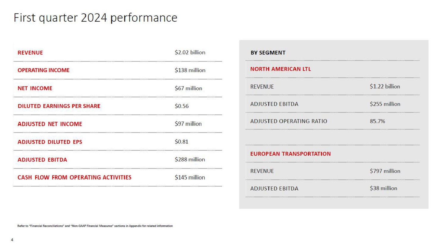 First quarter 2024 highlights $2.02 billion of revenue, up 6% YoY $288 million of adjusted EBITDA, up 37% YoY $0.81 of adjusted diluted EPS 1 , up 45% YoY LTL adjusted operating income of $175 million, up 50% YoY LTL adjusted operating ratio of 85.7%, improving by 390 bps YoY LTL tonnage per day up 2.6% YoY, with shipments per day up 4.7% LTL yield, excluding fuel, up 9.8% YoY LTL revenue per shipment, excluding fuel, up 7.9% YoY, accelerating from Q4’23 LTL damage claims ratio of 0.3%, a company record Second consecutive quarter with nearly 400 bps of adjusted OR YoY improvement 1 Diluted earnings from continuing operations per share Refer to “Financial Reconciliations” and “Non - GAAP Financial Measures” sections in Appendix for related information 3