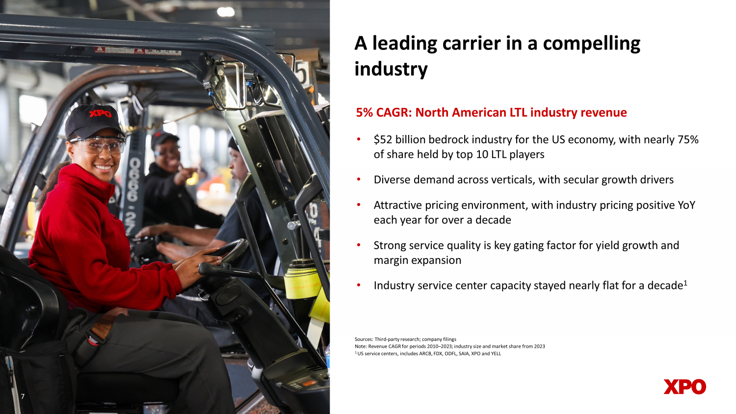 A major player in the supply - chain ecosystem 1 Excludes the company’s December 2023 acquisition of 28 service centers, not yet operational as of March 31, 2024 Note: Company data for North American LTL segment only as of March 31, 2024, unless otherwise noted as 2023 (full year) 3 rd largest LTL carrier by 2023 revenue 12.4% 2023 revenue allocated to gross capex 13 million s hipments per year 33 ,000 customers served $4.7 billion 2023 revenue 9 % 2023 industry share 8 13,0 0 0 d rivers 33 ,0 0 0 t railers 18 billion pounds of freight per year 6 5 0 million l inehaul miles run per year 2 3 ,0 0 0 e mployees 293 service centers 1 quarterly (bring back