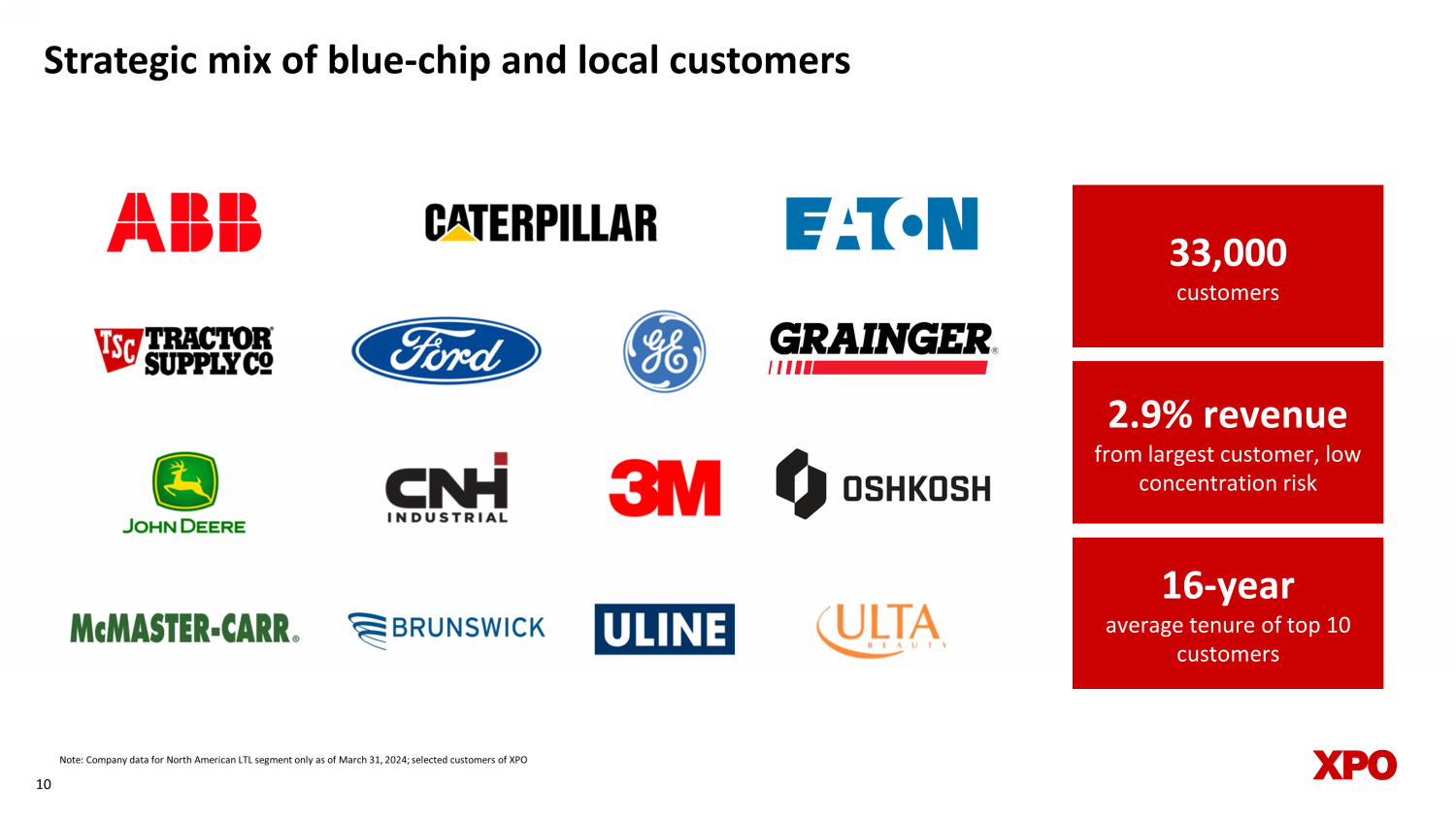 Strategic mix of blue - chip and local customers 10 2.9% revenue from largest customer, low concentration risk 16 - y ear average t enure of t op 10 customers 33,000 customers Note: Company data for North American LTL segment only as of March 31, 2024; selected customers of XPO