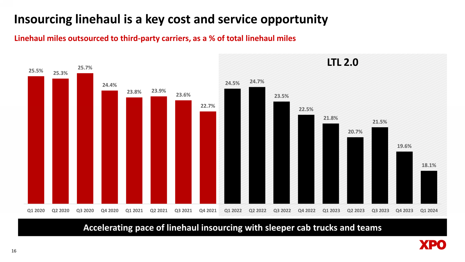 Earning price by delivering value through service excellence 15 Note: Gross revenue per hundredweight excludes the adjustment required for financial statement purposes in accordance with th e c ompany's revenue recognition policy Yield, excluding fuel, improved 9.8% year - over - year in Q1’24 Gross revenue per hundredweight (excluding fuel surcharges) LTL 2.0 $18.34 $18.45 $18.90 $18.82 $19.11 $19.29 $20.02 $20.90 $20.76 $21.34 $21.43 $21.19 $21.06 $21.63 $22.81 $23.37 $23.13 Q1 2020 Q2 2020 Q3 2020 Q4 2020 Q1 2021 Q2 2021 Q3 2021 Q4 2021 Q1 2022 Q2 2022 Q3 2022 Q4 2022 Q1 2023 Q2 2023 Q3 2023 Q4 2023 Q1 2024