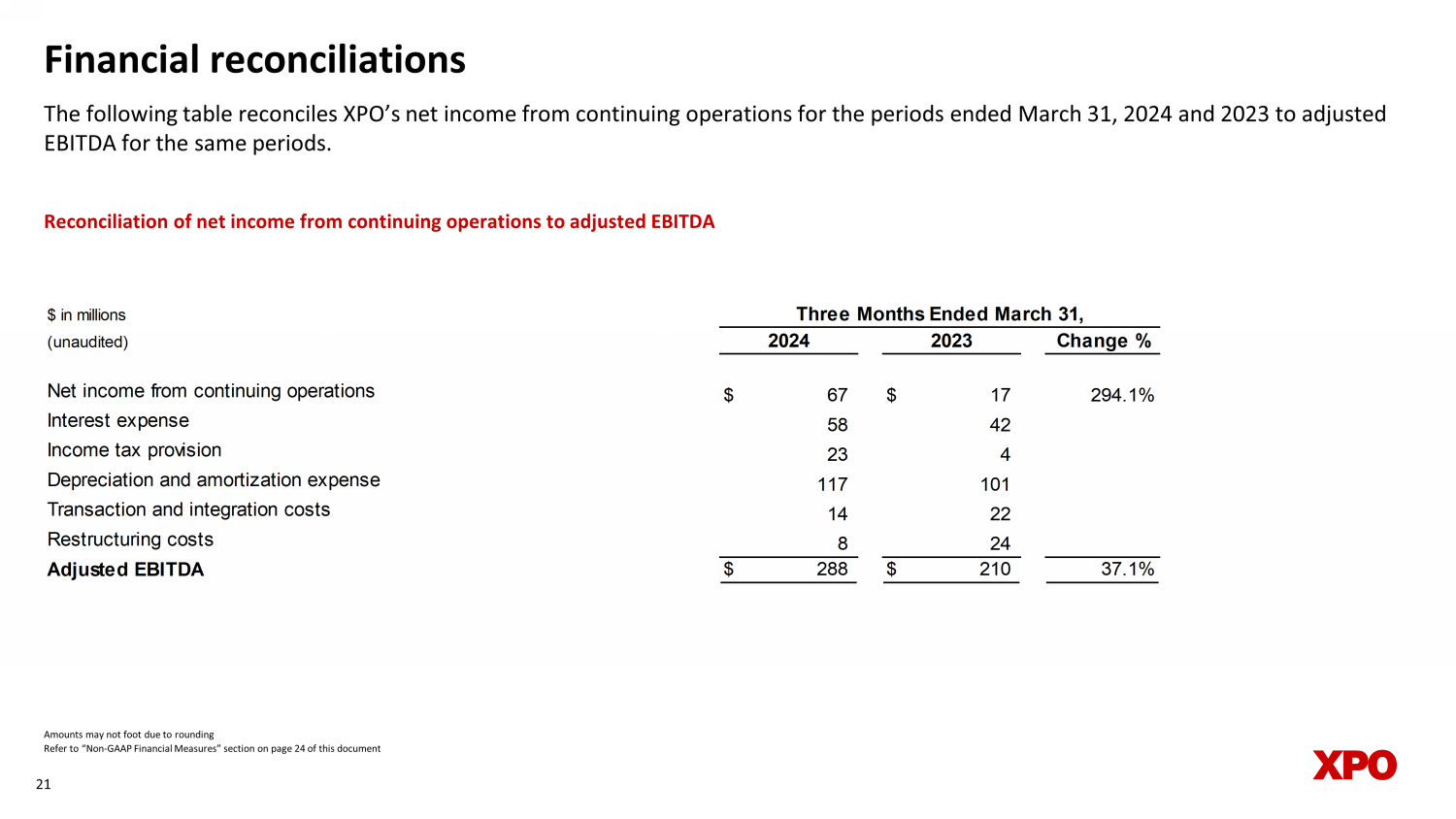 Financial reconciliations The following table reconciles XPO’s net income from continuing operations for the periods ended March 31, 2024 and 2023 to a dju sted EBITDA for the same periods. 21 Reconciliation of net income from continuing operations to adjusted EBITDA Amounts may not foot due to rounding Refer to “Non - GAAP Financial Measures” section on page 24 of this document $ in millions (unaudited) Change % Net income from continuing operations $ 67 $ 17 294.1% Interest expense 58 42 Income tax provision 23 4 Depreciation and amortization expense 117 101 Transaction and integration costs 14 22 Restructuring costs 8 24 Adjusted EBITDA $ 288 $ 210 37.1% Three Months Ended March 31, 2024 2023