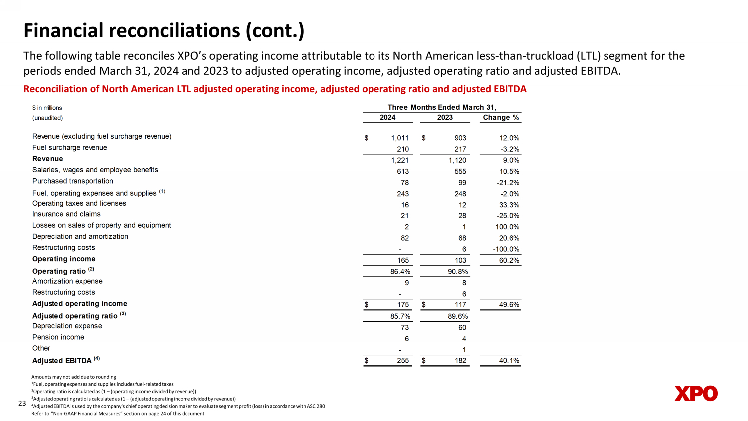 $ in millions (unaudited) Change % Revenue (excluding fuel surcharge revenue) $ 1,011 $ 903 12.0% Fuel surcharge revenue 210 217 -3.2% Revenue 1,221 1,120 9.0% Salaries, wages and employee benefits 613 555 10.5% Purchased transportation 78 99 -21.2% Fuel, operating expenses and supplies (1) 243 248 -2.0% Operating taxes and licenses 16 12 33.3% Insurance and claims 21 28 -25.0% Losses on sales of property and equipment 2 1 100.0% Depreciation and amortization 82 68 20.6% Restructuring costs - 6 -100.0% Operating income 165 103 60.2% Operating ratio (2) 86.4% 90.8% Amortization expense 9 8 Restructuring costs - 6 Adjusted operating income $ 175 $ 117 49.6% Adjusted operating ratio (3) 85.7% 89.6% Depreciation expense 73 60 Pension income 6 4 Other - 1 Adjusted EBITDA (4) $ 255 $ 182 40.1% 2024 2023 Three Months Ended March 31, Financial reconciliations (cont.) The following table reconciles XPO’s operating income attributable to its North American less - than - truckload (LTL) segment for t he periods ended March 31, 2024 and 2023 to adjusted operating income, adjusted operating ratio and adjusted EBITDA. 23 Reconciliation of N orth American LTL adjusted operating income, adjusted operating ratio and adjusted EBITDA Amounts may not add due to rounding 1 Fuel, operating expenses and supplies includes fuel - related taxes 2 Operating ratio is calculated as (1 – (operating income divided by revenue)) 3 Adjusted operating ratio is calculated as (1 – (adjusted operating income divided by revenue)) 4 Adjusted EBITDA is used by the company's chief operating decision maker to evaluate segment profit (loss) in accordance with ASC 280 Refer to “Non - GAAP Financial Measures” section on page 24 of this document