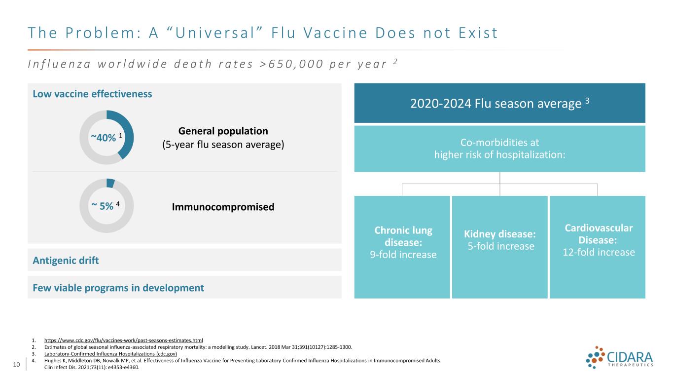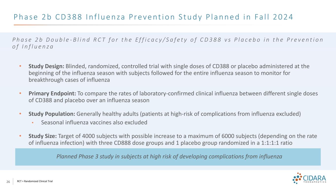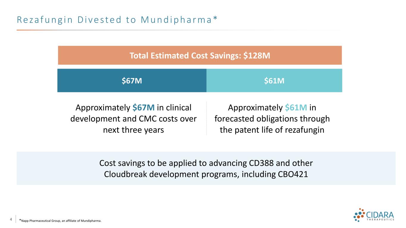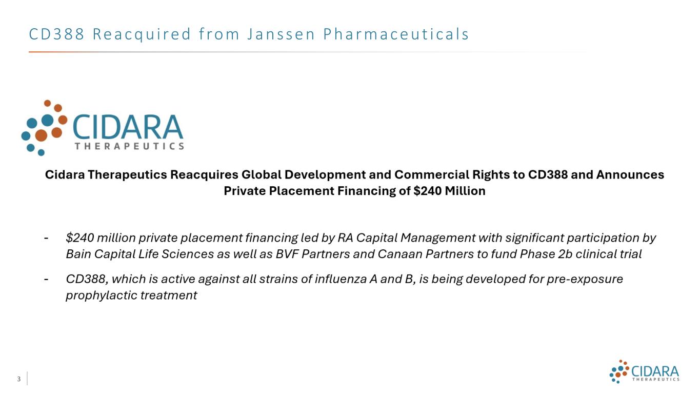 2 Fo r w a rd - L o o k i n g S ta t e m e n t s T h e s e s l i d e s c o n t a i n f o r w a r d - l o o k i n g s t a t e m e n t s w i t h i n t h e m e a n i n g o f t h e P r i v a t e S e c u r i t i e s L i t i g a t i o n R e f o r m A c t o f 1 9 9 5 . The words “may,” “will,” “estimate,” “plan”, “anticipate,” “expect,” “potential,” “could,” “project,” and similar expressions (including the negative thereof), are intended to identify forward-looking statements. Because such statements are subject to risks and uncertainties, actual results may differ materially from those expressed or implied by such forward-looking statements. Such statements include, but are not limited to, statements regarding Cidara’s research and development efforts; preclinical and clinical development activities; plans, projections and expectations for and the potential effectiveness, safety and benefits of, its product candidates, including CD388, CBO421 and other antiviral and oncology product candidates from the Cloudbreak platform; whether CD388 may have significant advantages beyond and in addition to flu vaccines; and advancement of its strategic plans Additional risks and uncertainties may emerge from time to time, and it is not possible for Cidara’s management to predict all risk factors and uncertainties. Cidara cautions that the foregoing list of factors is not exclusive and not to place undue reliance upon any forward-looking statements which speak only as of the date of this presentation. Except as required by law, Cidara does not undertake any obligation to update publicly any forward- looking statements for any reason after the date of this presentation to conform these statements to actual results or to changes in its expectations. Projections, assumptions and estimates of the future performance of the markets in which Cidara operates are necessarily subject to a high degree of uncertainty and risk, including, Cidara's ability to obtain additional financing; the success and timing of Cidara’s preclinical studies, clinical trials and other research and development activities; receipt of necessary regulatory approvals for development, as well as changes to applicable regulatory laws in the United States and foreign countries; changes in Cidara's plans to develop its product candidates; Cidara's ability to obtain and maintain intellectual property protection for its product candidates; and the loss of key scientific or management personnel. These and other risks and uncertainties are described more fully in Cidara's Annual Report on Form 10-K for the fiscal year ended December 31, 2023 filed with the United States Securities and Exchange Commission ("SEC“’) on April 22, 2024, and in Cidara’s other filings with the SEC.