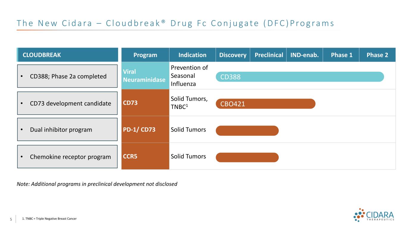 4 Re za f u n g i n D i v e s t e d t o M u n d i p h a r m a * Cost savings to be applied to advancing CD388 and other Cloudbreak development programs, including CBO421 $67M $61M Approximately $67M in clinical development and CMC costs over next three years Approximately $61M in forecasted obligations through the patent life of rezafungin *Napp Pharmaceutical Group, an affiliate of Mundipharma. Total Estimated Cost Savings: $128M
