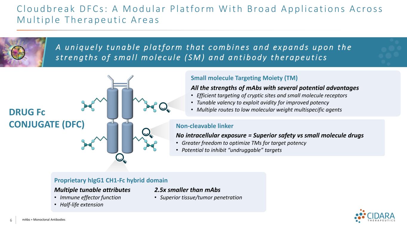 5 CLOUDBREAK T h e N e w C i d a ra – C l o u d b r e a k ® D r u g F c C o n j u g a t e ( D F C ) P ro g ra m s Program Indication Discovery Preclinical IND-enab. Phase 1 Phase 2 Viral Neuraminidase Prevention of Seasonal Influenza CD73 Solid Tumors, TNBC1 PD-1/ CD73 Solid Tumors CCR5 Solid Tumors Note: Additional programs in preclinical development not disclosed CD388 CBO421 • CD388; Phase 2a completed • CD73 development candidate • Dual inhibitor program • Chemokine receptor program 1. TNBC = Triple Negative Breast Cancer