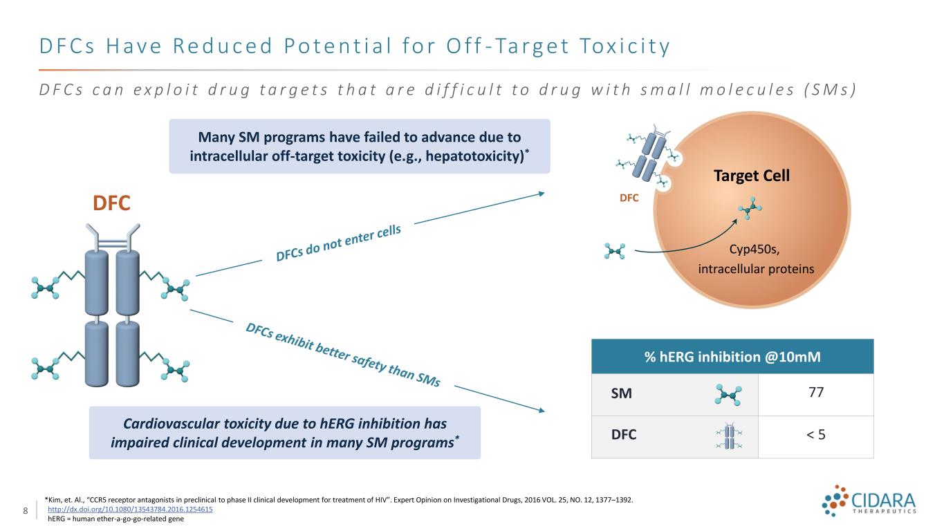 8 % hERG inhibition @10mM SM 77 DFC < 5 D F C s H av e Re d u c e d Po t e n t i a l fo r O f f - Ta rg e t Tox i c i t y Many SM programs have failed to advance due to intracellular off-target toxicity (e.g., hepatotoxicity)* Cardiovascular toxicity due to hERG inhibition has impaired clinical development in many SM programs* Target Cell Cyp450s, intracellular proteins DFC D F C s c a n e x p l o i t d r u g t a r g e t s t h a t a r e d i f f i c u l t t o d r u g w i t h s m a l l m o l e c u l e s ( S M s ) *Kim, et. Al., “CCR5 receptor antagonists in preclinical to phase II clinical development for treatment of HIV”. Expert Opinion on Investigational Drugs, 2016 VOL. 25, NO. 12, 1377–1392. http://dx.doi.org/10.1080/13543784.2016.1254615 hERG = human ether-a-go-go-related gene DFC
