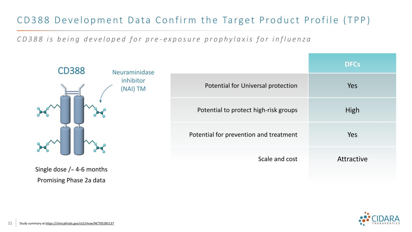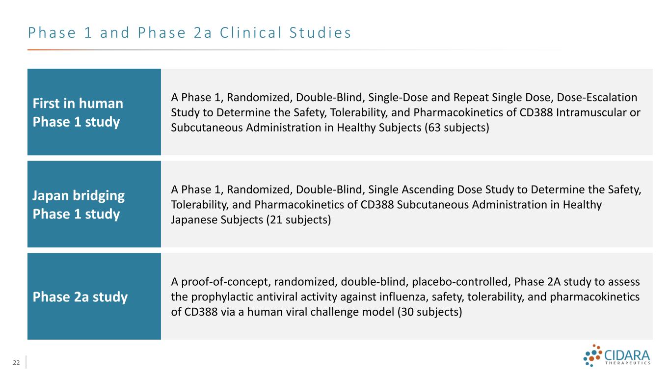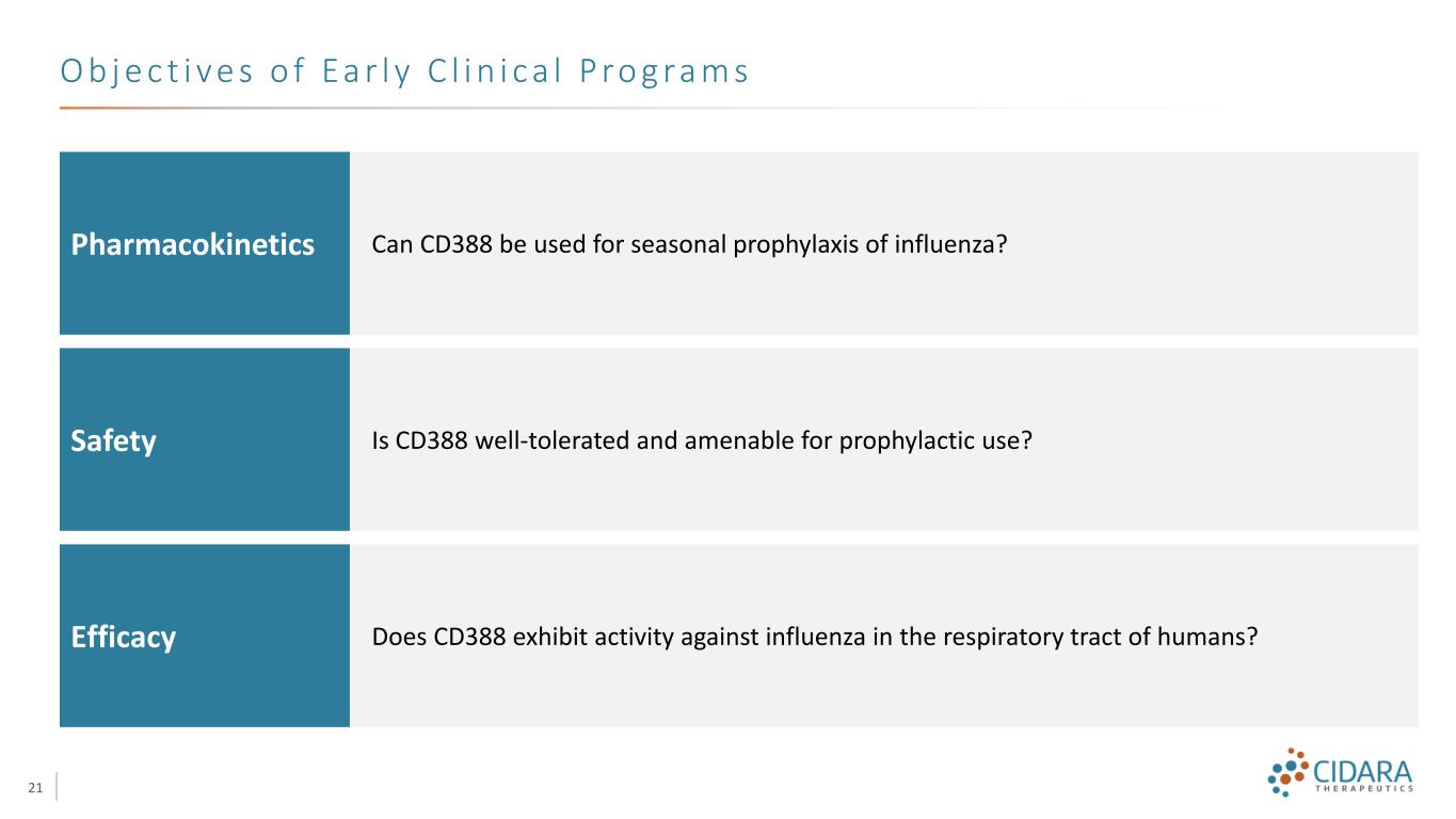 21 O b j e c t i v e s o f Ea r l y C l i n i c a l P ro g ra m s Can CD388 be used for seasonal prophylaxis of influenza?Pharmacokinetics Is CD388 well-tolerated and amenable for prophylactic use?Safety Does CD388 exhibit activity against influenza in the respiratory tract of humans?Efficacy