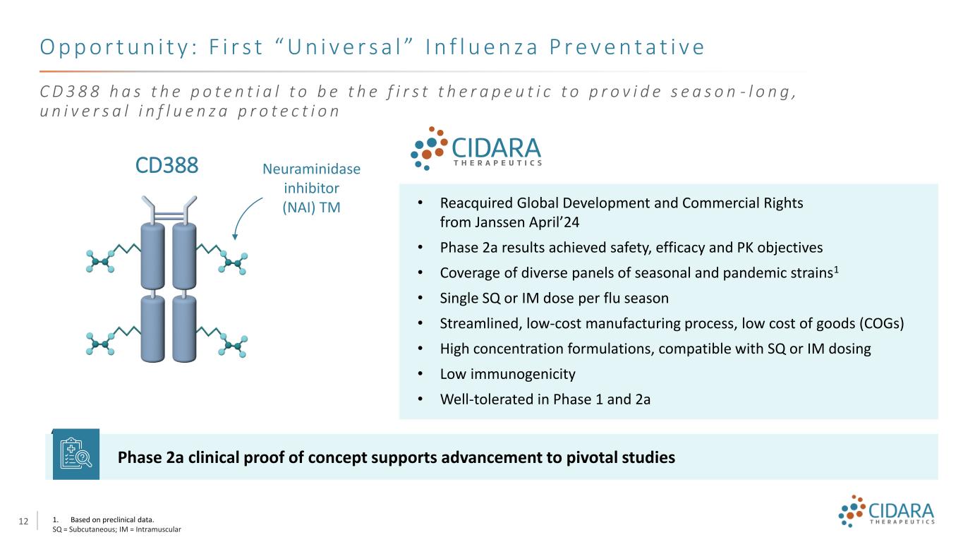 11 C D 3 8 8 D e v e l o p m e n t D ata C o n f i r m t h e Ta rg e t P ro d u c t P ro f i l e ( T P P ) Single dose / ̴ 4-6 months Promising Phase 2a data CD388 Neuraminidase inhibitor (NAI) TM Potential for Universal protection Potential to protect high-risk groups Potential for prevention and treatment Scale and cost High Yes Attractive DFCs Yes C D 3 8 8 i s b e i n g d e v e l o p e d f o r p r e - e x p o s u r e p r o p h y l a x i s f o r i n f l u e n z a Study summary at https://clinicaltrials.gov/ct2/show/NCT05285137