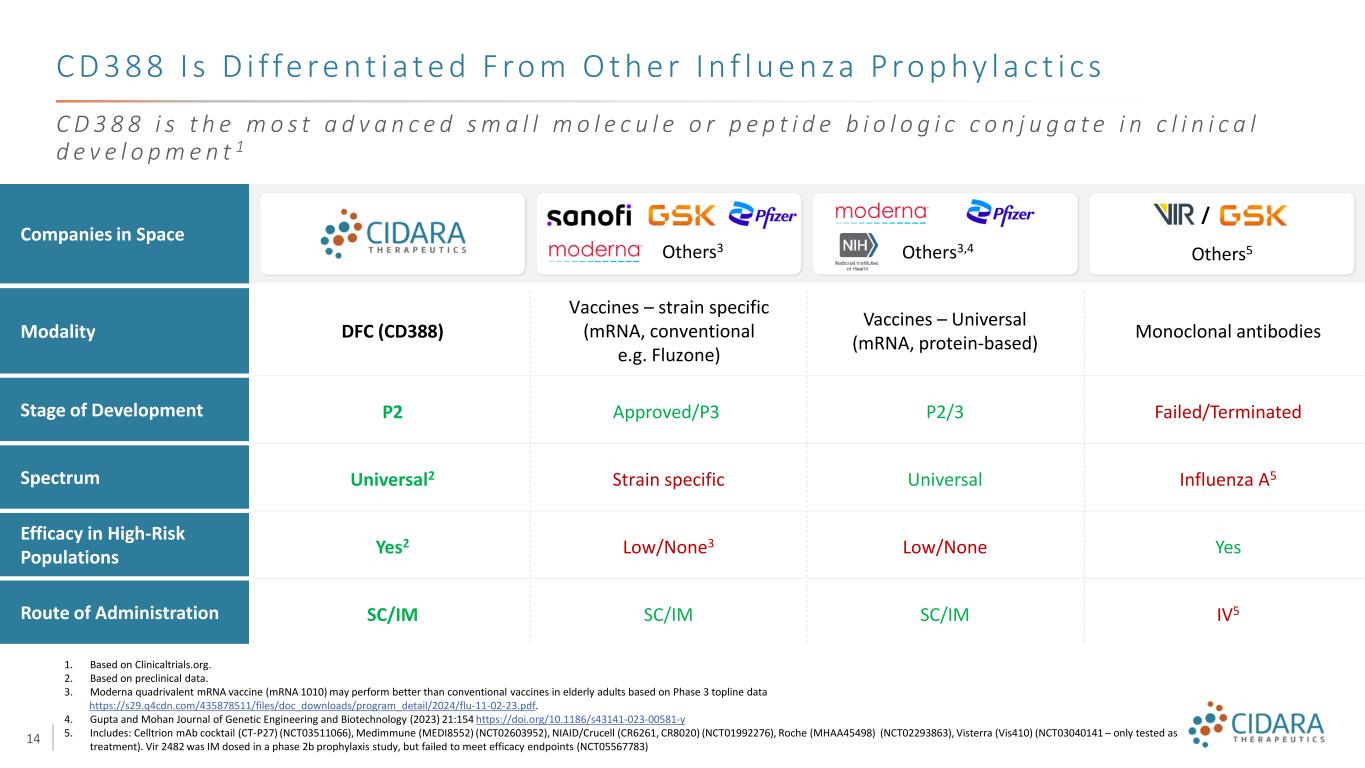 13 C o m p re h e n s i v e G l o b a l I P P ro t e c t s C D 3 8 8 E xc l u s i v i t y CD388 Zanamivir Dimer Linker DAR Fc Portfolio Highlights: • Global Portfolio Pending in 31 Jurisdictions • Eight Patent Families Directed to: − CD388 Composition of Matter* − Fc Construct Composition of Matter − Conjugation Methods* − Dosing Regimens • CD388 Composition of Matter Coverage Includes: − Zanamivir Conjugation Point Optionality* − Multiple Covalent Linker Options (length, composition, dimer spacer)* − Wide Drug-Antibody Ratio (DAR) Range* T w o I s s u e d U S C o m p o s i t i o n o f M a t t e r P a t e n t s – U S E x c l u s i v i t y t o S e p t . 2 0 3 9 ( + P T E ) As biologic agents, DFCs are not subject to the IP limitations of the Inflation Reduction Act (IRA) *Included in issued patents PTE = Patent Term Extension