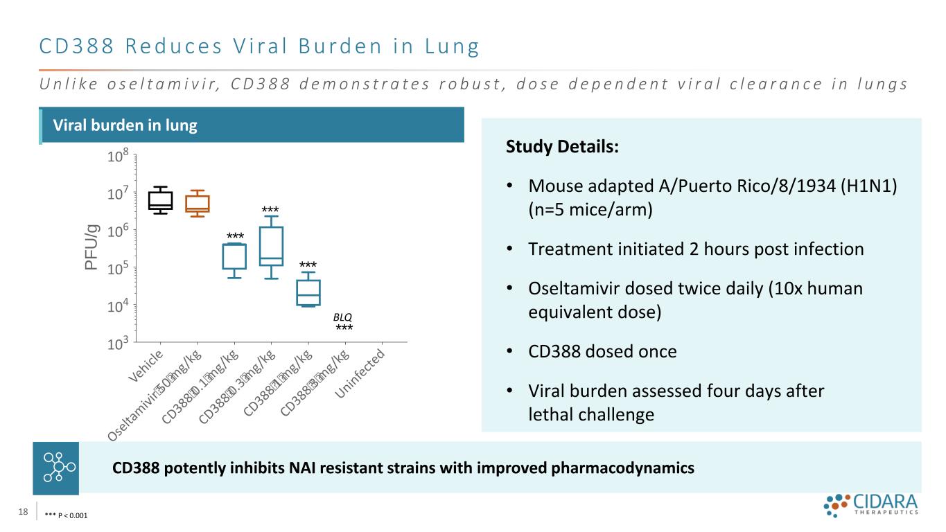 17 C D 3 8 8 R e t a i n s I n V i v o A c t i v i t y A g a i n s t H i g h l y N A I R e s i s t a n t S t r a i n s Strain Neuraminidase inhibition IC50 (nM) Protective dose (mg/kg) CD388 Zanamivir CD388 Zanamivir B/Laos/0080/2016 H134 (NAI-S) 7.44 2.61 0.3 1 B/Laos/0654/2016 H134N (NAI-R) 4.66 310.8 0.3 10 P r o t e c t i v e d o s e o f C D 3 8 8 d o e s n o t s h i f t i n m i c e i n f e c t e d w i t h m a t c h e d N A I s e n s i t i v e a n d N A I r e s i s t a n t s t r a i n s B/Laos/0654/2016 - H134N1B/Laos/0080/2016 - NAI Sensitive1 1. 5 animals/group treated a single IM dose of CD388 2-hours after viral challenge. Zanamivir dosed IN once daily for 5-days starting 2-hours after infection. Survival monitored for 21 days