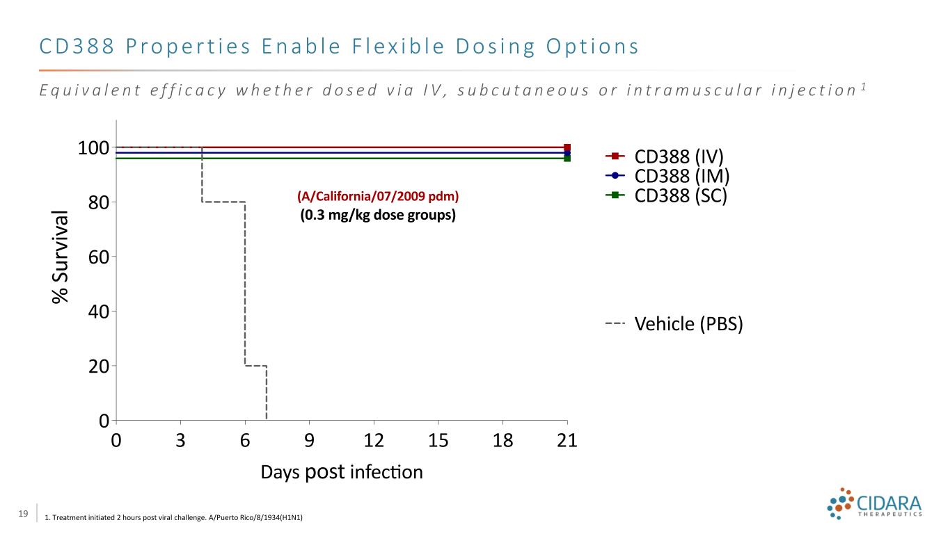 18 Ve hi cle Os el ta m ivi r 5 0 m g/ kg CD 38 8 0. 1 m g/ kg CD 38 8 0. 3 m g/ kg CD 38 8 1 m g/ kg CD 38 8 3 m g/ kg Un in fe ct ed 103 104 105 106 107 108 P F U /g *** *** *** *** C D 3 8 8 Re d u c e s V i ra l B u rd e n i n L u n g BLQ Study Details: • Mouse adapted A/Puerto Rico/8/1934 (H1N1) (n=5 mice/arm) • Treatment initiated 2 hours post infection • Oseltamivir dosed twice daily (10x human equivalent dose) • CD388 dosed once • Viral burden assessed four days after lethal challenge U n l i k e o s e l t a m i v i r , C D 3 8 8 d e m o n s t r a t e s r o b u s t , d o s e d e p e n d e n t v i r a l c l e a r a n c e i n l u n g s Viral burden in lung *** P < 0.001 CD388 potently inhibits NAI resistant strains with improved pharmacodynamics