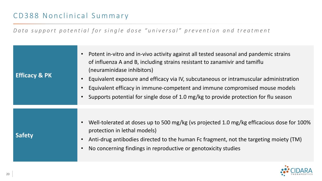 19 C D 3 8 8 P ro p e r t i e s E n a b l e F l ex i b l e D o s i n g O p t i o n s Bioavailability of multiple formulations highlights potential for SC dosing in oncology indications E q u i v a l e n t e f f i c a c y w h e t h e r d o s e d v i a I V , s u b c u t a n e o u s o r i n t r a m u s c u l a r i n j e c t i o n 1 1. Treatment initiated 2 hours post viral challenge. A/Puerto Rico/8/1934(H1N1)