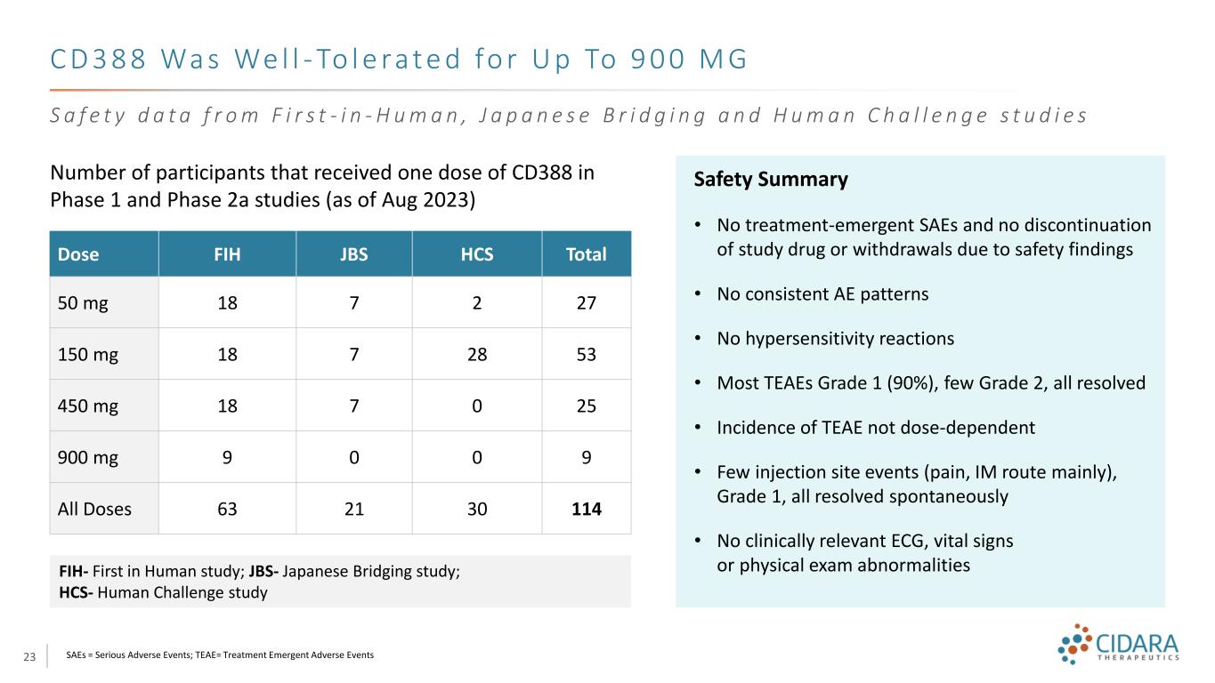 22 P h a s e 1 a n d P h a s e 2 a C l i n i c a l S t u d i e s A Phase 1, Randomized, Double-Blind, Single-Dose and Repeat Single Dose, Dose-Escalation Study to Determine the Safety, Tolerability, and Pharmacokinetics of CD388 Intramuscular or Subcutaneous Administration in Healthy Subjects (63 subjects) First in human Phase 1 study A Phase 1, Randomized, Double-Blind, Single Ascending Dose Study to Determine the Safety, Tolerability, and Pharmacokinetics of CD388 Subcutaneous Administration in Healthy Japanese Subjects (21 subjects) Japan bridging Phase 1 study A proof-of-concept, randomized, double-blind, placebo-controlled, Phase 2A study to assess the prophylactic antiviral activity against influenza, safety, tolerability, and pharmacokinetics of CD388 via a human viral challenge model (30 subjects) Phase 2a study
