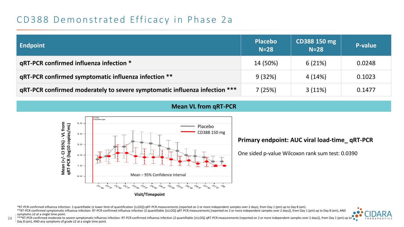 23 C D 3 8 8 Wa s We l l - To l e ra t e d fo r U p To 9 0 0 M G Dose FIH JBS HCS Total 50 mg 18 7 2 27 150 mg 18 7 28 53 450 mg 18 7 0 25 900 mg 9 0 0 9 All Doses 63 21 30 114 Number of participants that received one dose of CD388 in Phase 1 and Phase 2a studies (as of Aug 2023) FIH- First in Human study; JBS- Japanese Bridging study; HCS- Human Challenge study Safety Summary • No treatment-emergent SAEs and no discontinuation of study drug or withdrawals due to safety findings • No consistent AE patterns • No hypersensitivity reactions • Most TEAEs Grade 1 (90%), few Grade 2, all resolved • Incidence of TEAE not dose-dependent • Few injection site events (pain, IM route mainly), Grade 1, all resolved spontaneously • No clinically relevant ECG, vital signs or physical exam abnormalities S a f e t y d a t a f r o m F i r s t - i n - H u m a n , J a p a n e s e B r i d g i n g a n d H u m a n C h a l l e n g e s t u d i e s SAEs = Serious Adverse Events; TEAE= Treatment Emergent Adverse Events
