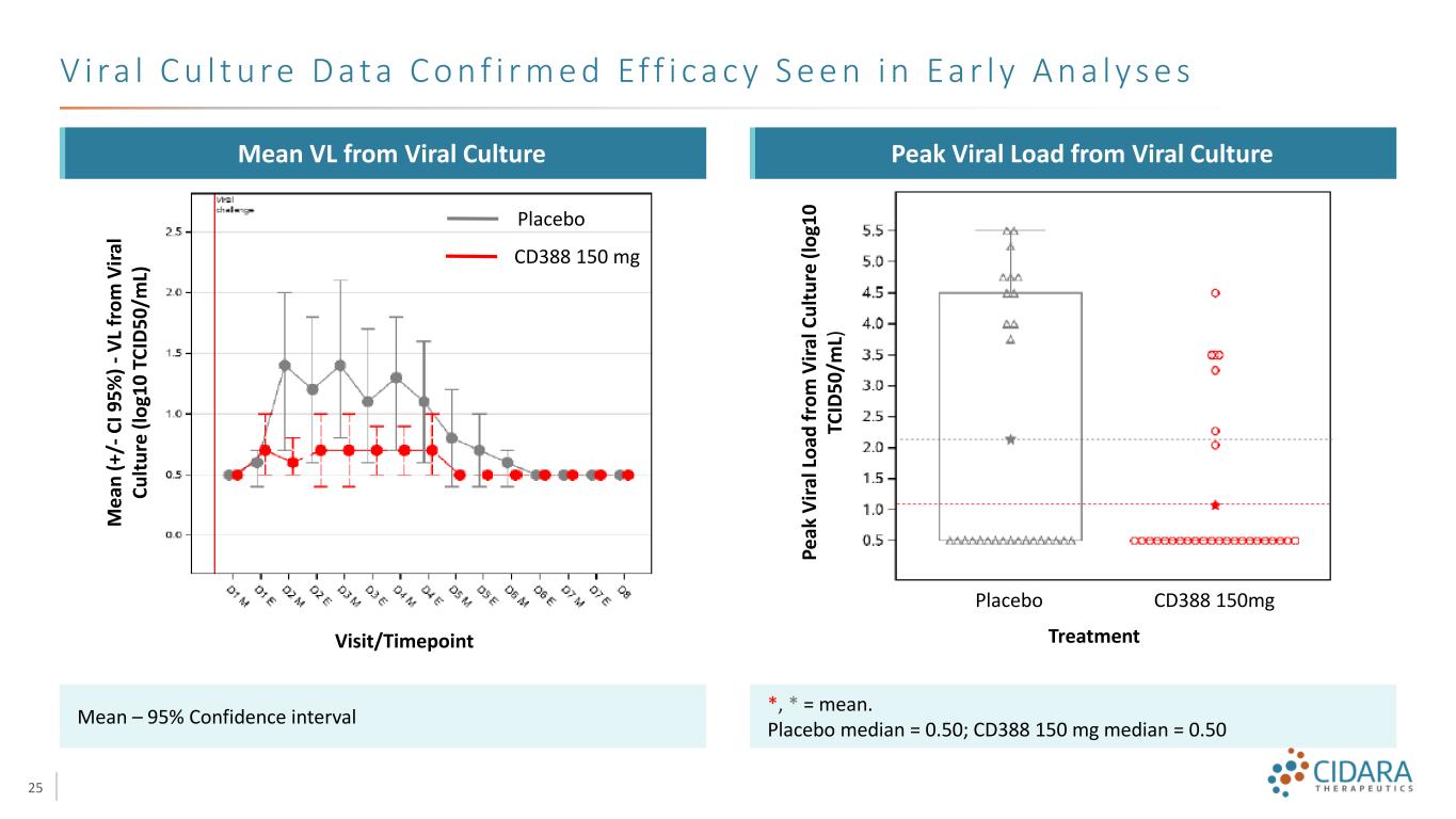 24 Endpoint Placebo N=28 CD388 150 mg N=28 P-value qRT-PCR confirmed influenza infection * 14 (50%) 6 (21%) 0.0248 qRT-PCR confirmed symptomatic influenza infection ** 9 (32%) 4 (14%) 0.1023 qRT-PCR confirmed moderately to severe symptomatic influenza infection *** 7 (25%) 3 (11%) 0.1477 Primary endpoint: AUC viral load-time_ qRT-PCR One sided p-value Wilcoxon rank sum test: 0.0390 Mean VL from qRT-PCR Visit/Timepoint Mean – 95% Confidence interval Placebo CD388 150 mg C D 3 8 8 D e m o n st ra t e d Ef f i c a c y i n P h a s e 2 a *RT-PCR-confirmed influenza infection: 2 quantifiable (≥ lower limit of quantification [LLOQ]) qRT-PCR measurements (reported on 2 or more independent samples over 2 days), from Day 1 (pm) up to Day 8 (am). **RT-PCR-confirmed symptomatic influenza infection: RT-PCR-confirmed influenza infection (2 quantifiable [≥LLOQ] qRT-PCR measurements [reported on 2 or more independent samples over 2 days]), from Day 1 (pm) up to Day 8 (am), AND symptoms ≥2 at a single time point. ***RT-PCR-confirmed moderate to severe symptomatic influenza infection: RT-PCR confirmed influenza infection (2 quantifiable [≥LLOQ] qRT-PCR measurements [reported on 2 or more independent samples over 2 days]), from Day 1 (pm) up to Day 8 (am), AND any symptoms of grade ≥2 at a single time point. M ea n ( +/ - C I 9 5 % ) - V L fr o m q R T -P C R ( lo g1 0 c o p ie s/ m L)