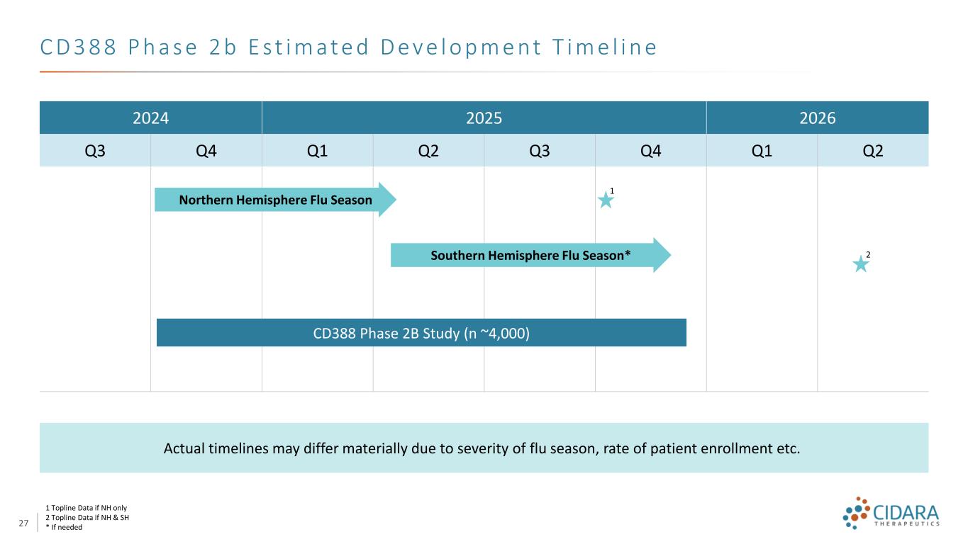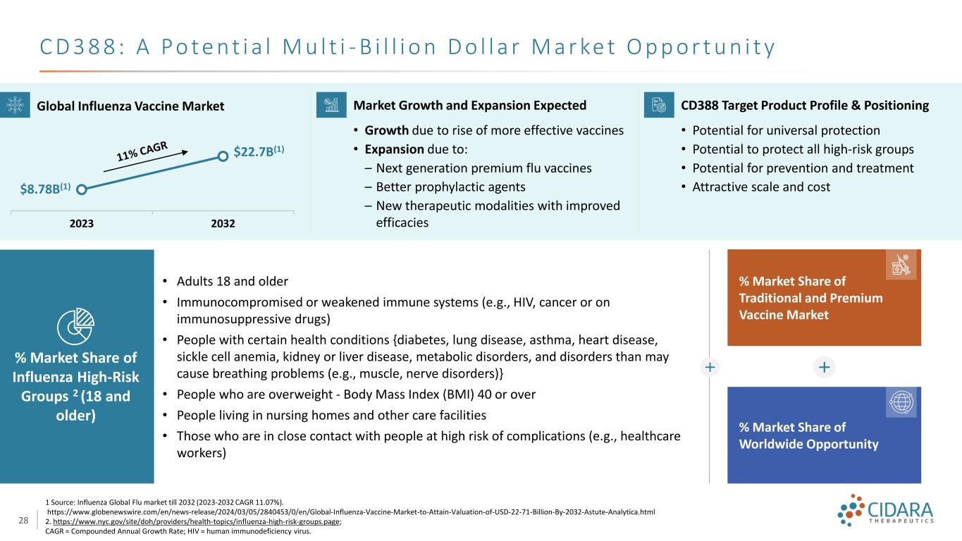 27 2024 2025 2026 Q3 Q4 Q1 Q2 Q3 Q4 Q1 Q2 C D 3 8 8 P h a s e 2 b E s t i m at e d D e v e l o p m e n t T i m e l i n e CD388 Phase 2B Study (n ~4,000) 2 Northern Hemisphere Flu Season Southern Hemisphere Flu Season* 1 Actual timelines may differ materially due to severity of flu season, rate of patient enrollment etc. 1 Topline Data if NH only 2 Topline Data if NH & SH * If needed