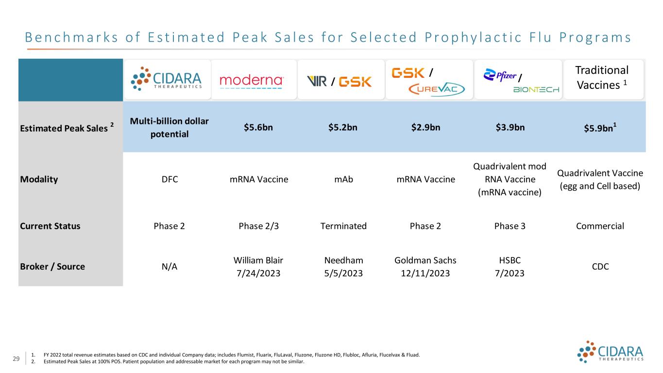 28 C D 3 8 8 : A Po t e n t i a l M u l t i - B i l l i o n D o l l a r M a r ke t O p p o r t u n i t y 1 Source: Influenza Global Flu market till 2032 (2023-2032 CAGR 11.07%). https://www.globenewswire.com/en/news-release/2024/03/05/2840453/0/en/Global-Influenza-Vaccine-Market-to-Attain-Valuation-of-USD-22-71-Billion-By-2032-Astute-Analytica.html 2. https://www.nyc.gov/site/doh/providers/health-topics/influenza-high-risk-groups.page; CAGR = Compounded Annual Growth Rate; HIV = human immunodeficiency virus. $8.78B(1) $22.7B(1) 2023 2032 • Potential for universal protection • Potential to protect all high-risk groups • Potential for prevention and treatment • Attractive scale and cost CD388 Target Product Profile & Positioning • Growth due to rise of more effective vaccines • Expansion due to: – Next generation premium flu vaccines – Better prophylactic agents – New therapeutic modalities with improved efficacies Market Growth and Expansion ExpectedGlobal Influenza Vaccine Market % Market Share of Influenza High-Risk Groups 2 (18 and older) • Adults 18 and older • Immunocompromised or weakened immune systems (e.g., HIV, cancer or on immunosuppressive drugs) • People with certain health conditions {diabetes, lung disease, asthma, heart disease, sickle cell anemia, kidney or liver disease, metabolic disorders, and disorders than may cause breathing problems (e.g., muscle, nerve disorders)} • People who are overweight - Body Mass Index (BMI) 40 or over • People living in nursing homes and other care facilities • Those who are in close contact with people at high risk of complications (e.g., healthcare workers) % Market Share of Traditional and Premium Vaccine Market % Market Share of Worldwide Opportunity
