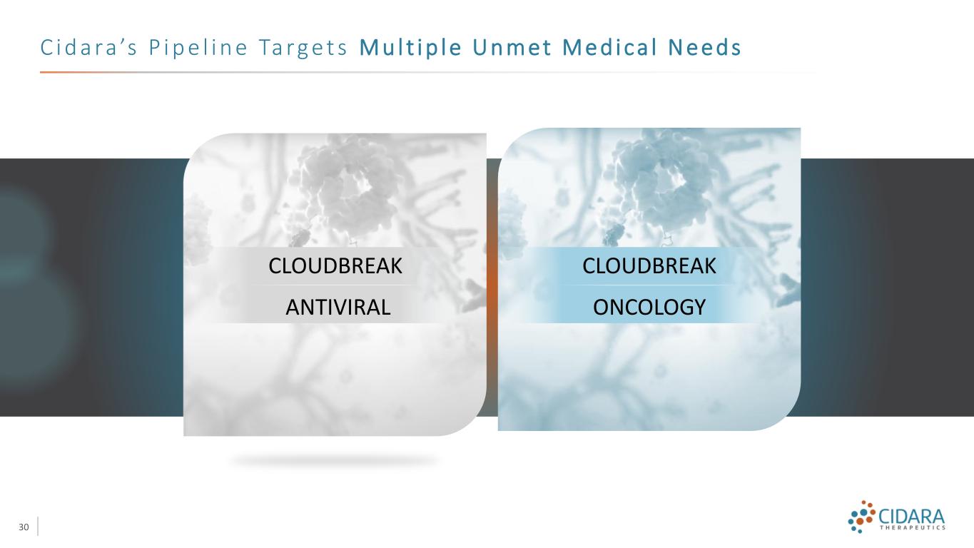 9 C i d a ra ’s P i p e l i n e Ta rg e t s M u l t i p l e U n m e t M e d i c a l N e e d s CLOUDBREAK ANTIVIRAL CLOUDBREAK ONCOLOGY