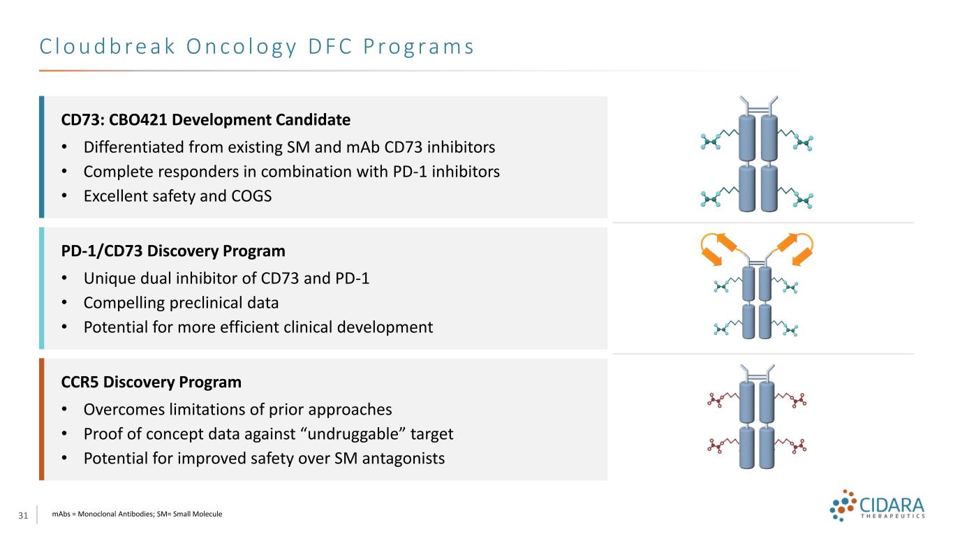 30 C i d a ra ’s P i p e l i n e Ta rg e t s M u l t i p l e U n met M e d i ca l N e e d s CLOUDBREAK ANTIVIRAL CLOUDBREAK ONCOLOGY