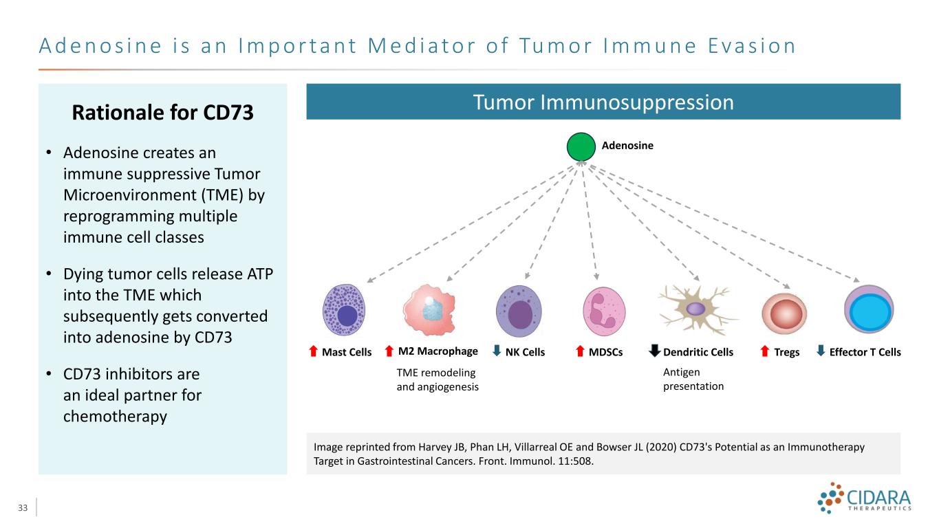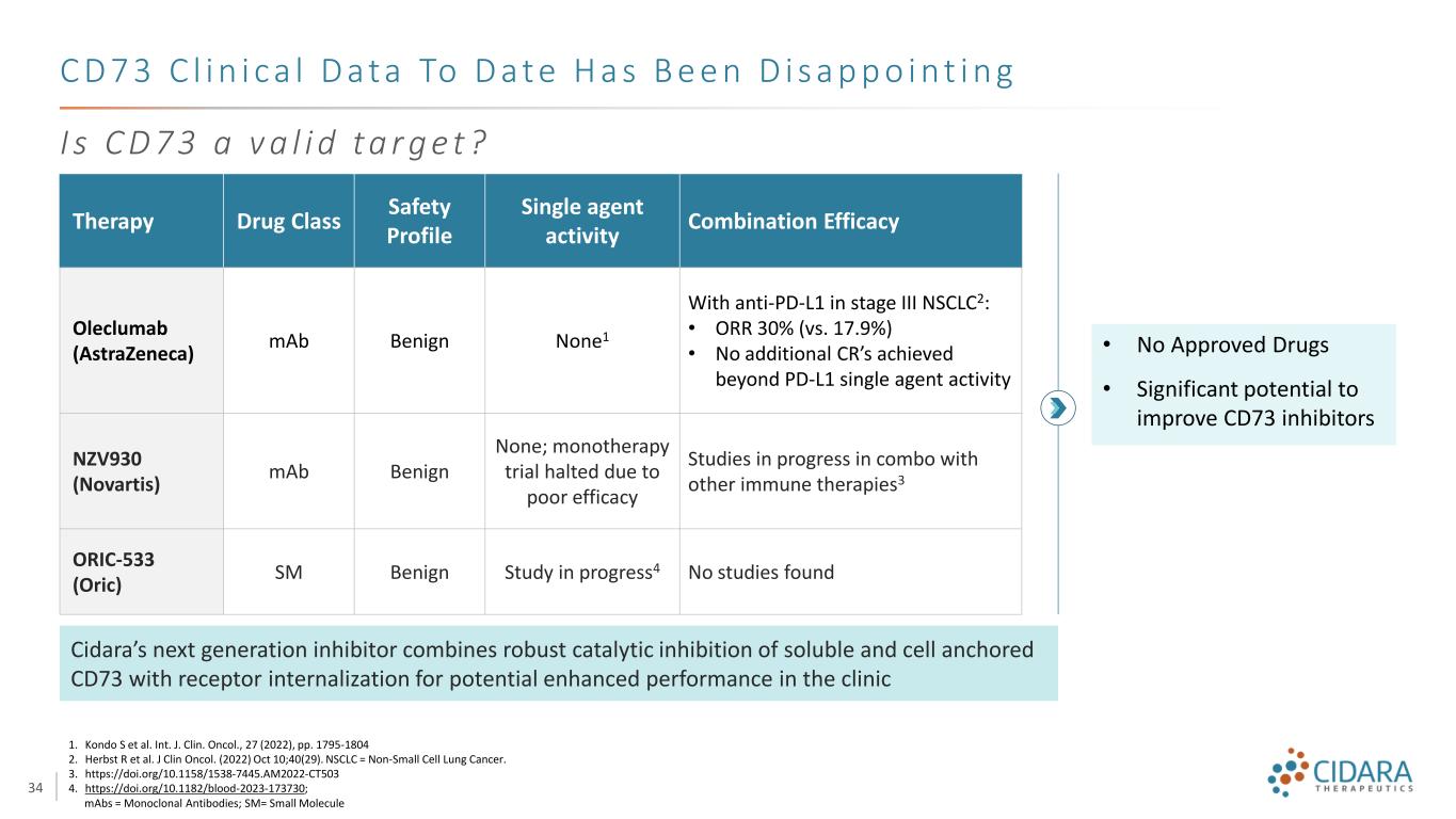 33 Rationale for CD73 • Adenosine creates an immune suppressive Tumor Microenvironment (TME) by reprogramming multiple immune cell classes • Dying tumor cells release ATP into the TME which subsequently gets converted into adenosine by CD73 • CD73 inhibitors are an ideal partner for chemotherapy Mast Cells M2 Macrophage NK Cells MDSCs Dendritic Cells Tregs Effector T Cells TME remodeling and angiogenesis Antigen presentation Adenosine Tumor Immunosuppression A d e n o s i n e i s a n I m p o r ta n t M e d i a t o r o f Tu m o r I m m u n e Eva s i o n Image reprinted from Harvey JB, Phan LH, Villarreal OE and Bowser JL (2020) CD73's Potential as an Immunotherapy Target in Gastrointestinal Cancers. Front. Immunol. 11:508.