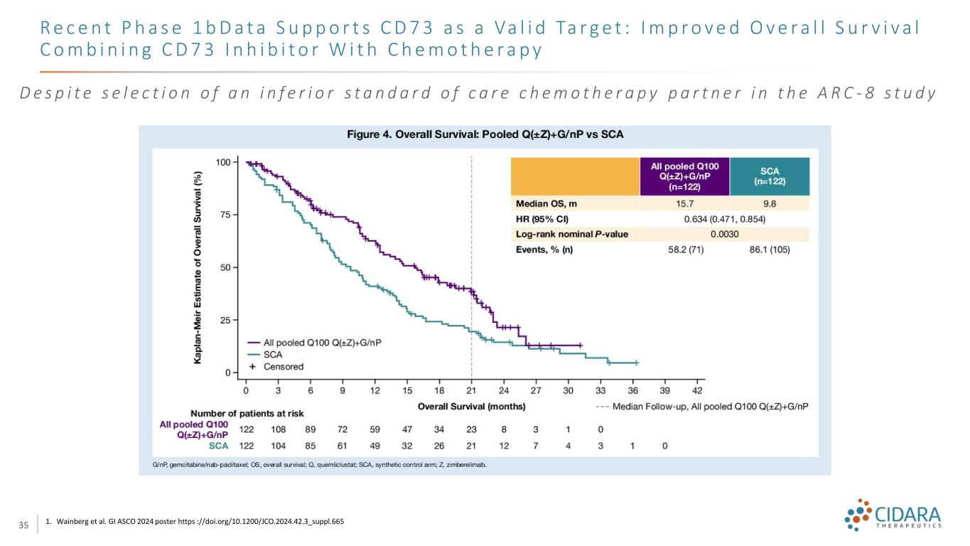 34 C D 7 3 C l i n i c a l D ata To D at e H a s B e e n D i s a p p o i n t i n g Therapy Drug Class Safety Profile Single agent activity Combination Efficacy Oleclumab (AstraZeneca) mAb Benign None1 With anti-PD-L1 in stage III NSCLC2: • ORR 30% (vs. 17.9%) • No additional CR’s achieved beyond PD-L1 single agent activity NZV930 (Novartis) mAb Benign None; monotherapy trial halted due to poor efficacy Studies in progress in combo with other immune therapies3 ORIC-533 (Oric) SM Benign Study in progress4 No studies found • No Approved Drugs • Significant potential to improve CD73 inhibitors 1. Kondo S et al. Int. J. Clin. Oncol., 27 (2022), pp. 1795-1804 2. Herbst R et al. J Clin Oncol. (2022) Oct 10;40(29). NSCLC = Non-Small Cell Lung Cancer. 3. https://doi.org/10.1158/1538-7445.AM2022-CT503 4. https://doi.org/10.1182/blood-2023-173730; I s C D 7 3 a v a l i d ta r g e t ? Cidara’s next generation inhibitor combines robust catalytic inhibition of soluble and cell anchored CD73 with receptor internalization for potential enhanced performance in the clinic mAbs = Monoclonal Antibodies; SM= Small Molecule