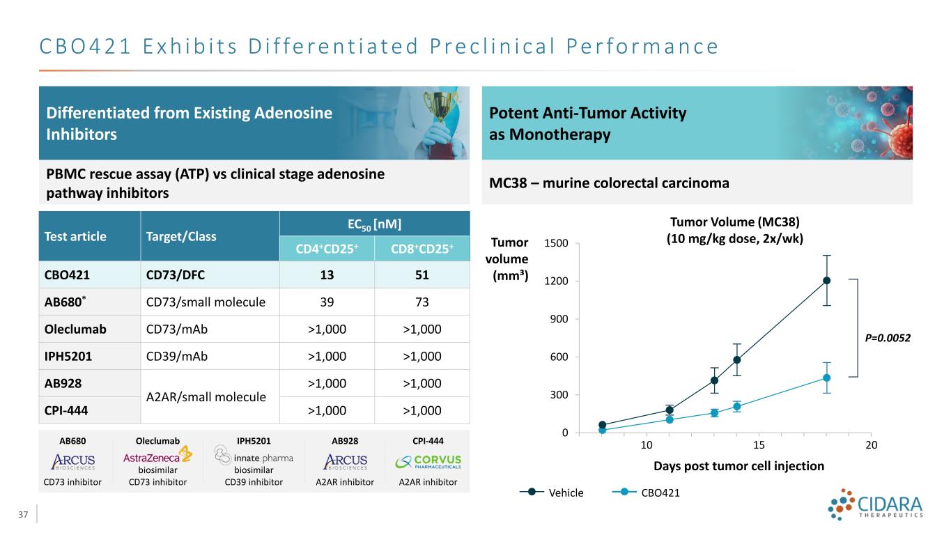 36 C B O 4 2 1 E m e rg i n g a s a D i f fe re n t i a t e d C D 7 3 T h e ra p y CBO421 CD73 ADO X AMP • Differentiated from existing SM and mAb CD73 inhibitors • Highly stable with excellent pharmaceutical properties • ~65 kDa (vs > 150 kDa for mAbs) – better tumor penetration • Inhibits both membrane bound and soluble CD73, downregulates CD73 via internalization • Ideal combination partner agent with PD-1/L1 axis inhibitors and chemotherapy • Robust manufacturing process