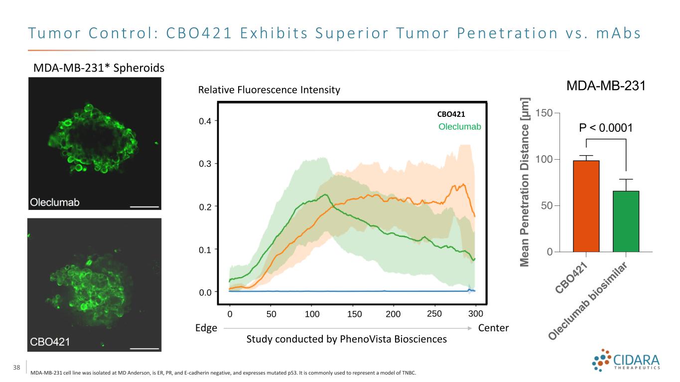 38 Tu m o r C o n t ro l : C B O 4 2 1 E x h i b i t s S u p e r i o r Tu m o r Pe n e t rat i o n v s . m A b s CD421 Oleclumab 0 50 100 150 200 250 300 0.0 0.1 0.2 0.3 0.4 CBO421 Relative Fluorescence Intensity Edge Center MDA-MB-231* Spheroids Study conducted by PhenoVista Biosciences MDA-MB-231 cell line was isolated at MD Anderson, is ER, PR, and E-cadherin negative, and expresses mutated p53. It is commonly used to represent a model of TNBC.