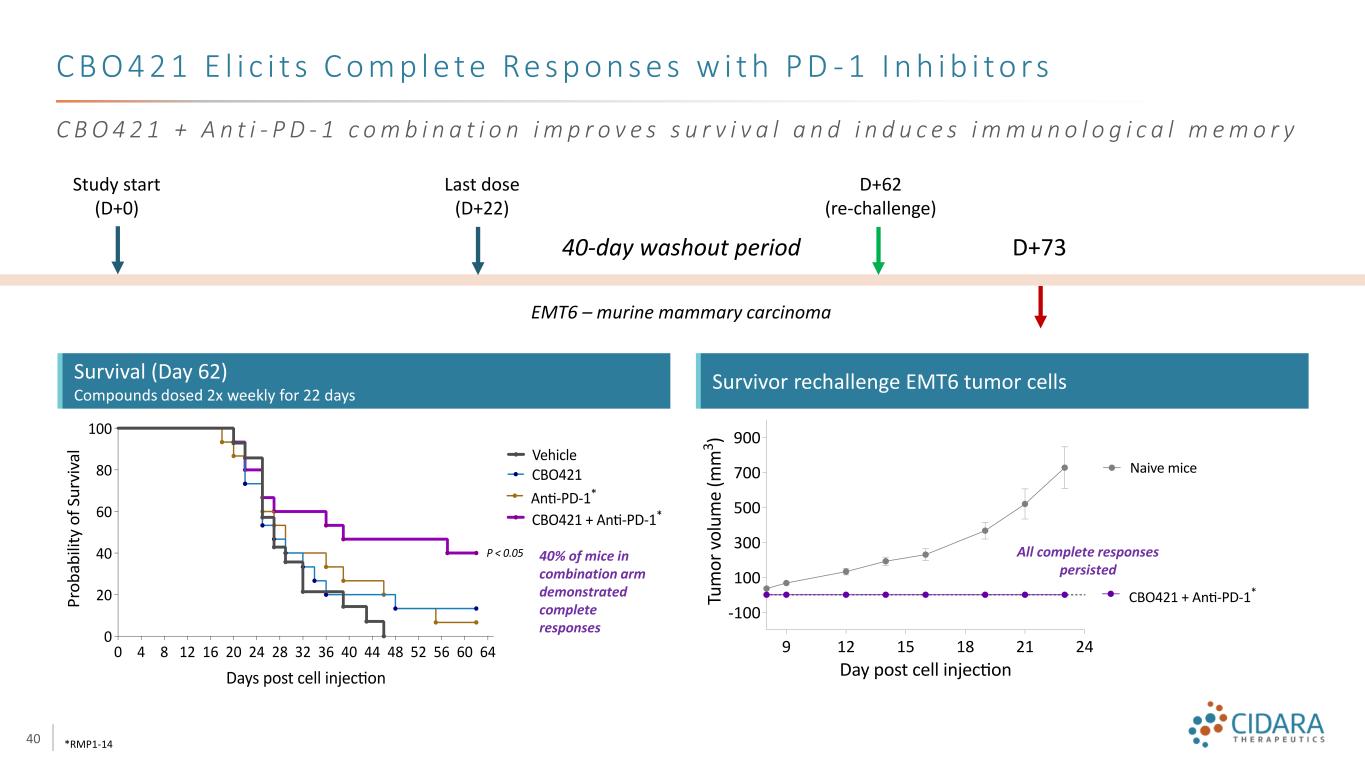 39 MC38 – murine colorectal carcinoma C B O 4 2 1 E n h a n c e s A n t i - t u m o r A c t i v i t y O f P D - 1 I n h i b i t o rs Study Arm % Responders2 Vehicle 0 CBO421 27 Anti-PD-11 47 CBO421 + Anti-PD-11 60 1. *RMP1-14 2. Defined as mice that demonstrate cessation of tumor growth or reduction in tumor volume across two or more timepoints. C B O 4 2 1 + A n t i - P D - 1 c o m b i n a t i o n i m p r o v e s r e s p o n s e r a t e s v e r s u s m o n o t h e r a p y