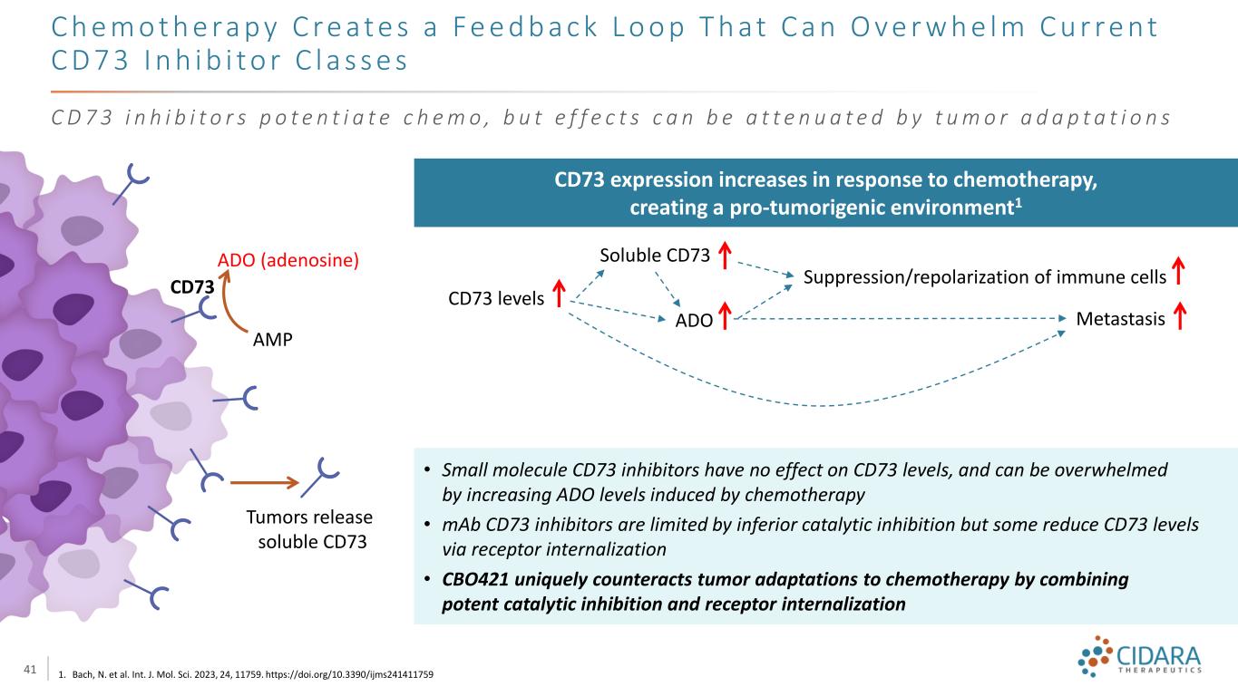 41 CD73 expression increases in response to chemotherapy, creating a pro-tumorigenic environment1 • Small molecule CD73 inhibitors have no effect on CD73 levels, and can be overwhelmed by increasing ADO levels induced by chemotherapy • mAb CD73 inhibitors are limited by inferior catalytic inhibition but some reduce CD73 levels via receptor internalization • CBO421 uniquely counteracts tumor adaptations to chemotherapy by combining potent catalytic inhibition and receptor internalization C h e m o t h e ra p y C re at e s a Fe e d b a c k L o o p T h at C a n O v e r w h e l m C u r re n t C D 7 3 I n h i b i t o r C l a s s e s AMP ADO (adenosine) Tumors release soluble CD73 CD73 CD73 levels ADO Soluble CD73 Metastasis Suppression/repolarization of immune cells 1. Bach, N. et al. Int. J. Mol. Sci. 2023, 24, 11759. https://doi.org/10.3390/ijms241411759 C D 7 3 i n h i b i t o r s p o t e n t i a t e c h e m o , b u t e f f e c t s c a n b e a t t e n u a t e d b y t u m o r a d a p t a t i o n s