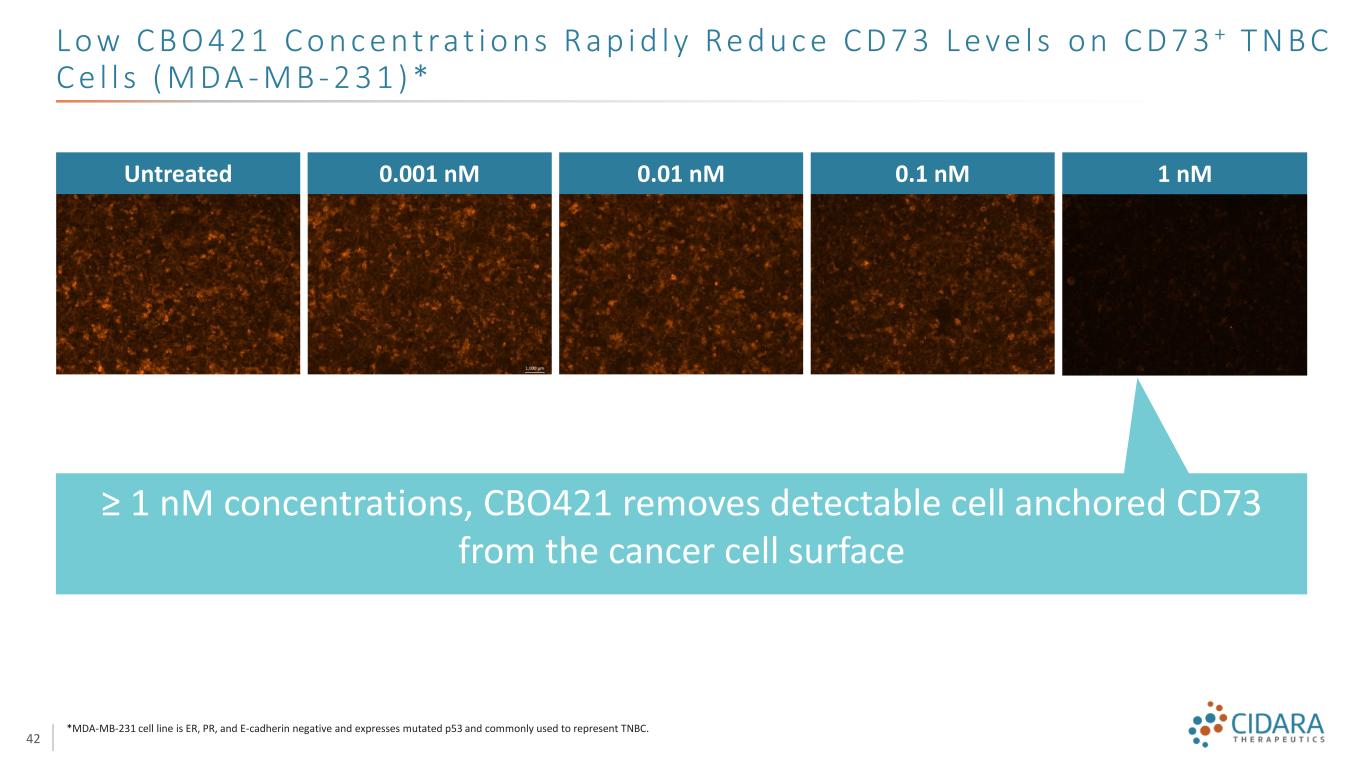 42 ≥ 1 nM concentrations, CBO421 removes detectable cell anchored CD73 from the cancer cell surface L o w C B O 4 2 1 C o n c e n t rat i o n s R a p i d l y Re d u c e C D 7 3 L e v e l s o n C D 7 3 + T N B C C e l l s ( M DA - M B - 2 3 1 ) * 1 nMUntreated 0.001 nM 0.01 nM 0.1 nM *MDA-MB-231 cell line is ER, PR, and E-cadherin negative and expresses mutated p53 and commonly used to represent TNBC.
