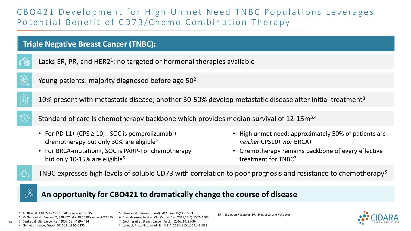 43 Test article Target/Class Maximum % internalization EC50 [nM] CBO421 CD73/DFC 81 0.07 AB680* CD73/small molecule 0* NA Oleclumab# CD73/mAb 38 0.27 C o m b i n at i o n o f Re c e p t o r I n t e r n a l i za t i o n a n d Po t e n t C ata l y t i c I n h i b i t i o n Po s i t i o n s C B O 4 2 1 a s a n I d e a l C h e m o t h e ra p y Pa r t n e r CD73 Internalization on MDA-MB-231 tumor cells by flow cytometry (4 hours post incubation) °MDA-MB-231 cell line was isolated at MD Anderson, is ER, PR, and E-cadherin negative, and expresses mutated p53. It is commonly used to represent a model of TNBC. *AB680 – Arcus Biosciences CD73 inhibitor, internalization data not shown #Oleclumab – Astra Zeneca biosimilar CD73 inhibitor CBO421 combines potent CD73 inhibition and CD73 downregulation, distinguishing it from small molecule and mAb CD73 inhibitors in clinical trials