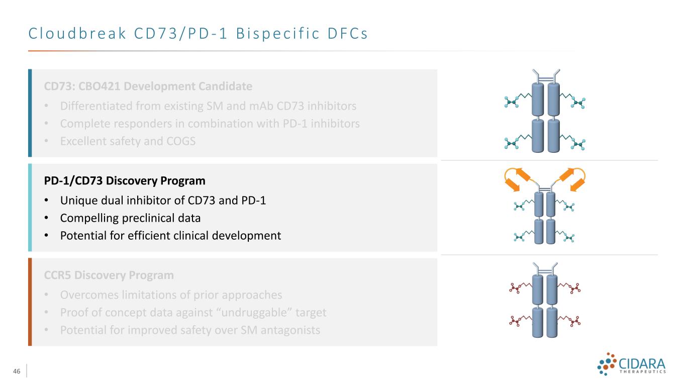 46 C l o u d b re a k C D 7 3 / P D - 1 B i s p e c i f i c D F C s CD73: CBO421 Development Candidate • Differentiated from existing SM and mAb CD73 inhibitors • Complete responders in combination with PD-1 inhibitors • Excellent safety and COGS PD-1/CD73 Discovery Program • Unique dual inhibitor of CD73 and PD-1 • Compelling preclinical data • Potential for efficient clinical development CCR5 Discovery Program • Overcomes limitations of prior approaches • Proof of concept data against “undruggable” target • Potential for improved safety over SM antagonists