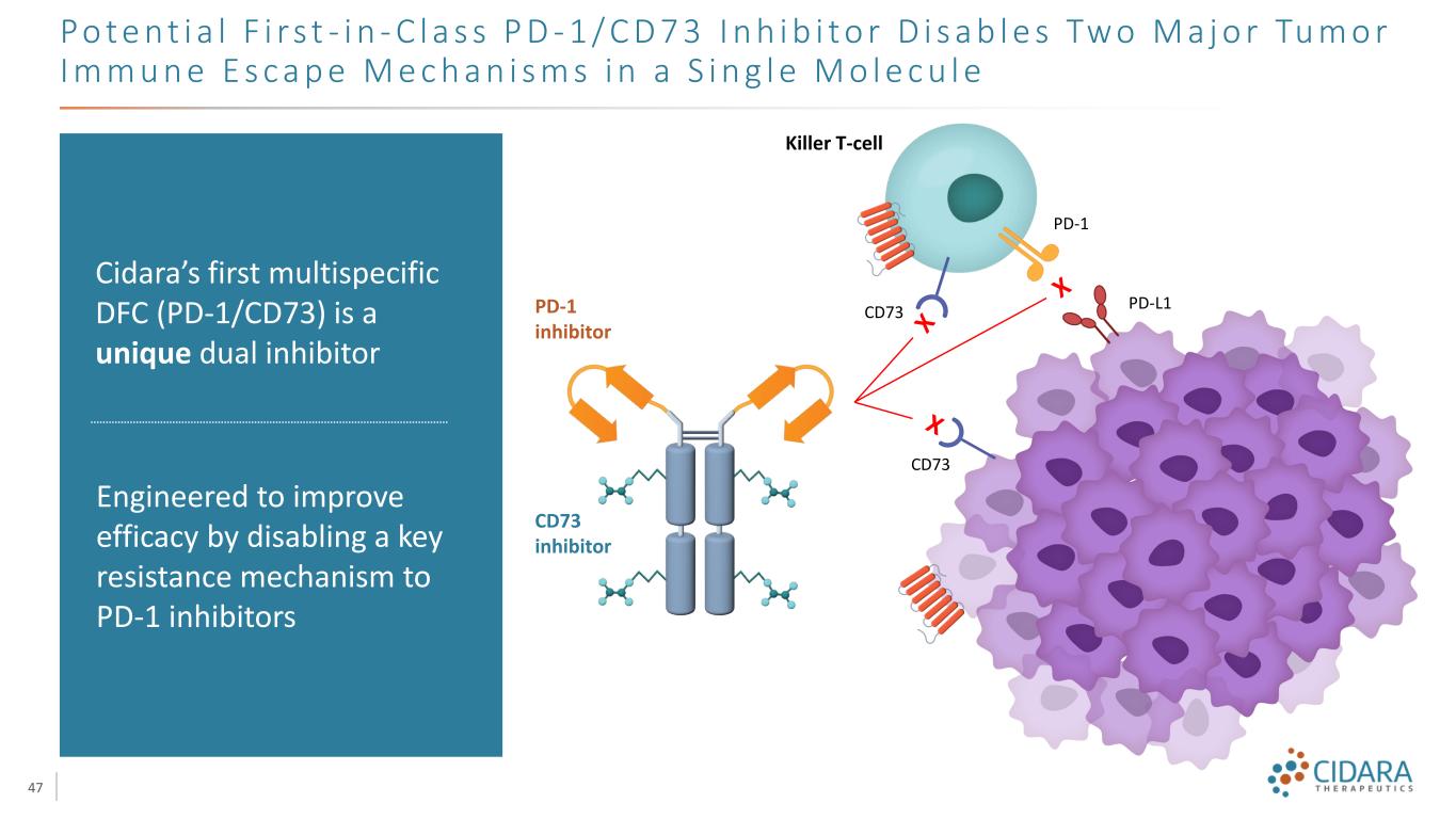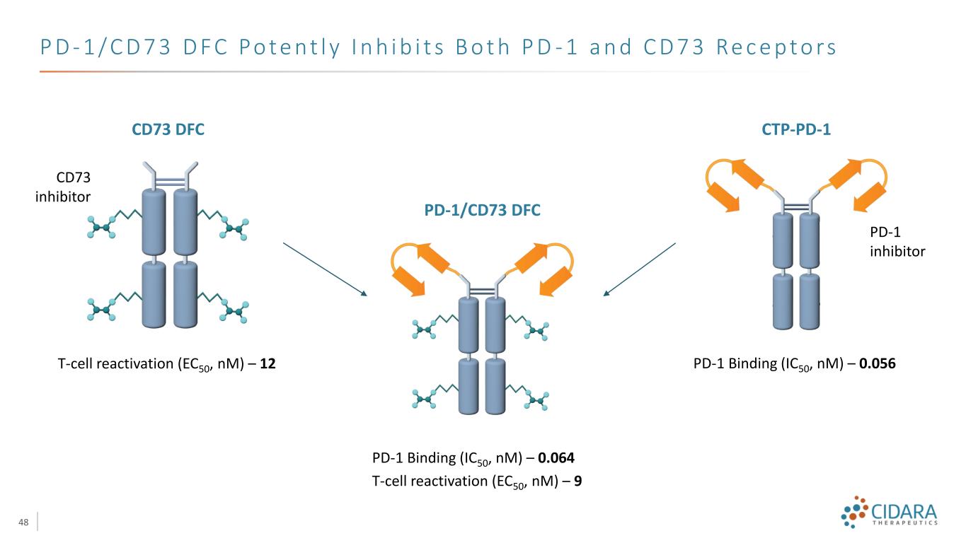 47 Po t e n t i a l F i rs t - i n - C l a s s P D - 1 / C D 7 3 I n h i b i t o r D i s a b l e s Tw o M a j o r Tu m o r I m m u n e E s c a p e M e c h a n i s m s i n a S i n g l e M o l e c u l e CD73 inhibitor Killer T-cell PD-1 CD73 CD73 PD-1 inhibitor PD-L1 Cidara’s first multispecific DFC (PD-1/CD73) is a unique dual inhibitor Engineered to improve efficacy by disabling a key resistance mechanism to PD-1 inhibitors