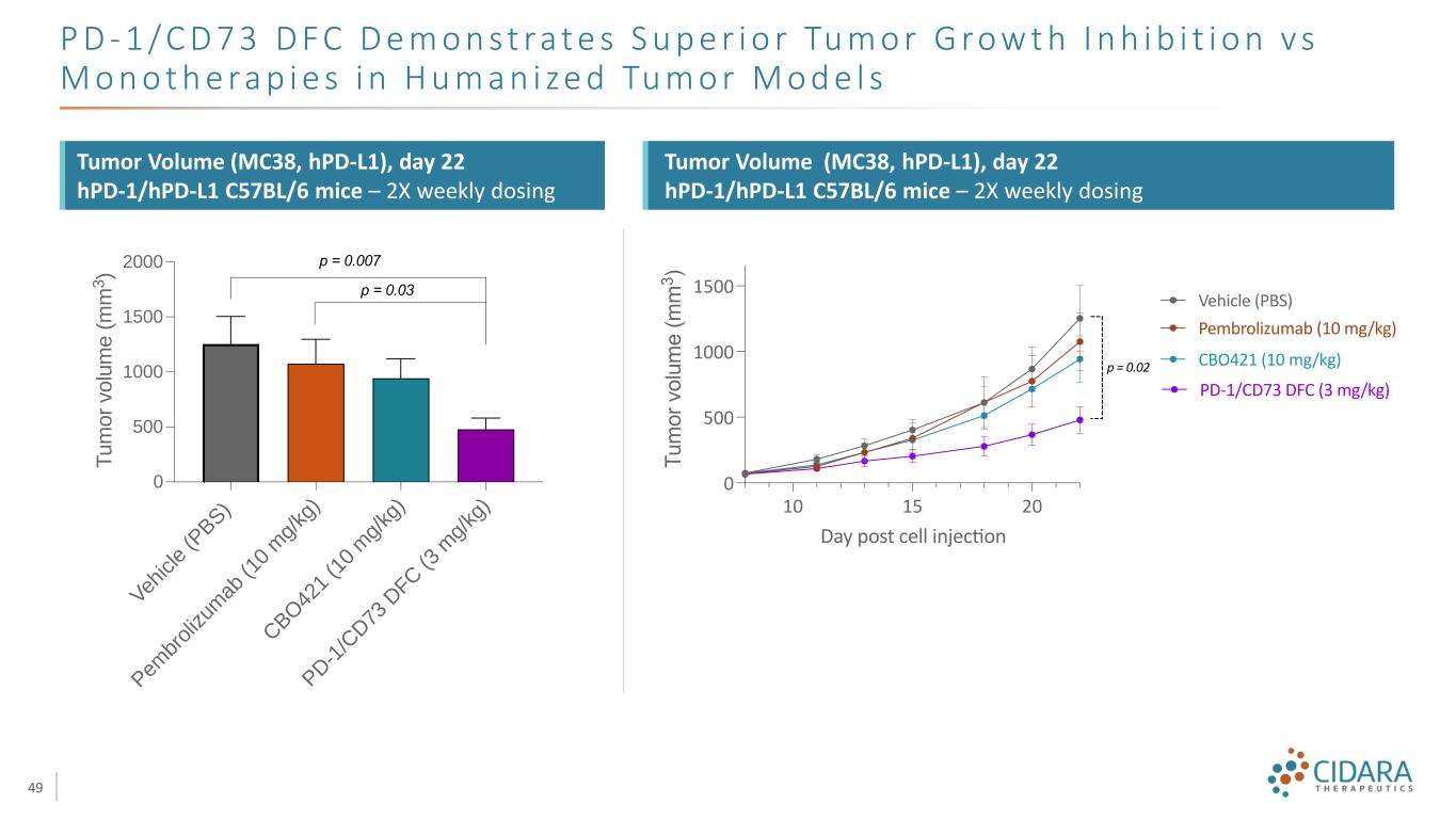 48 CTP-PD-1 PD-1/CD73 DFC CD73 DFC P D - 1 / C D 7 3 D F C Po t e n t l y I n h i b i t s B o t h P D - 1 a n d C D 7 3 Re c e p t o rs CD73 inhibitor PD-1 Binding (IC50, nM) – 0.056 T-cell reactivation (EC50, nM) – 12 PD-1 Binding (IC50, nM) – 0.064 T-cell reactivation (EC50, nM) – 9 PD-1 inhibitor