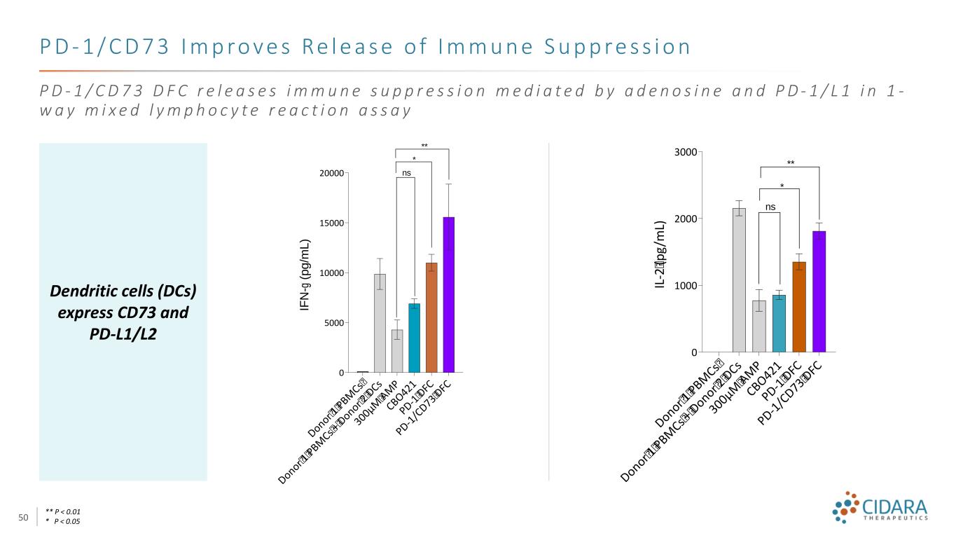 50 Dendritic cells (DCs) express CD73 and PD-L1/L2 P D - 1 / C D 7 3 I m p ro v e s Re l e a s e o f I m m u n e S u p p re s s i o n Do no r 1 P BM Cs Do no r 1 P BM Cs + D on or 2 D Cs 30 0µ M A M P CB O4 21 PD -1 D FC PD -1 /C D7 3 DF C 0 1000 2000 3000 IL -2 ( p g/ m L) ns * ** Do no r 1 P BM Cs Do no r 1 P BM Cs + D on or 2 D Cs 30 0µ M A M P CB O4 21 PD -1 D FC PD -1 /C D7 3 DF C 0 5000 10000 15000 20000 IF N -g ( p g /m L ) ns * ** P D - 1 / C D 7 3 D F C r e l e a s e s i m m u n e s u p p r e s s i o n m e d i a t e d b y a d e n o s i n e a n d P D - 1 / L 1 i n 1 - w a y m i x e d l y m p h o c y t e r e a c t i o n a s s a y ** P < 0.01 * P < 0.05