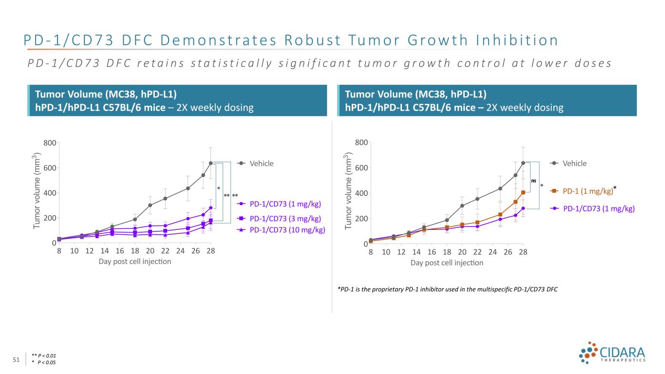 51 * ns * Tumor Volume (MC38, hPD-L1) hPD-1/hPD-L1 C57BL/6 mice – 2X weekly dosing Tumor Volume (MC38, hPD-L1) hPD-1/hPD-L1 C57BL/6 mice – 2X weekly dosing P D - 1 / C D 7 3 D F C D e m o n st ra t e s Ro b u st Tu m o r G ro w t h I n h i b i t i o n * ** ** P D - 1 / C D 7 3 D F C r e t a i n s s t a t i s t i c a l l y s i g n i f i c a n t t u m o r g r o w t h c o n t r o l a t l o w e r d o s e s ** P < 0.01 * P < 0.05 *PD-1 is the proprietary PD-1 inhibitor used in the multispecific PD-1/CD73 DFC