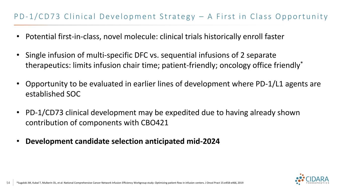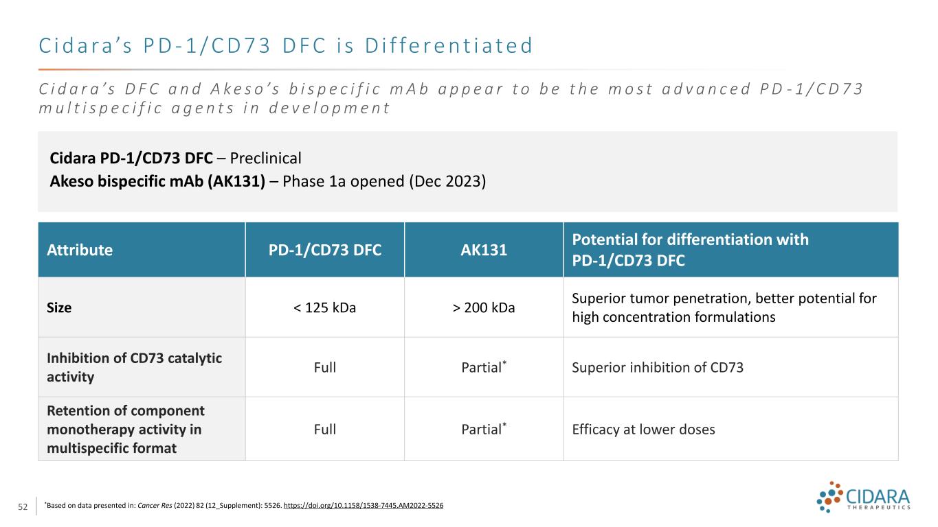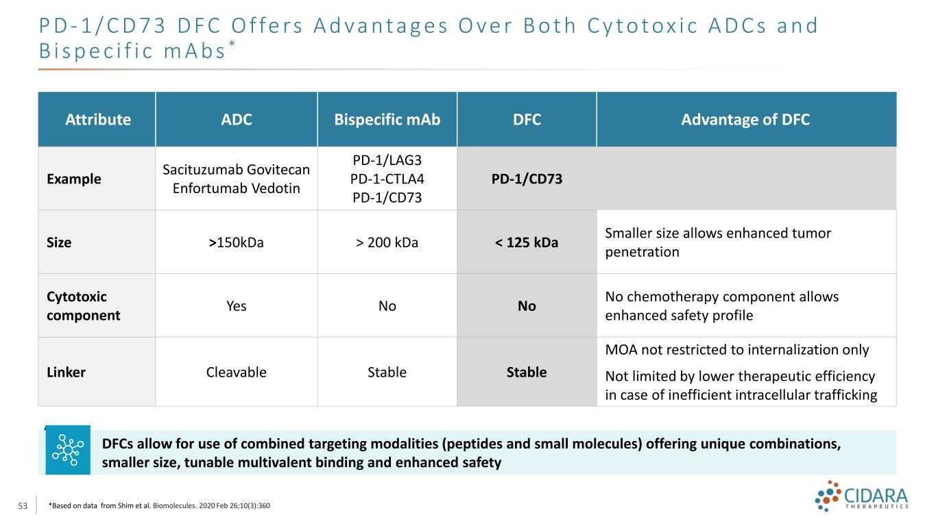 52 C i d a ra ’s P D - 1 / C D 7 3 D F C i s D i f fe re n t i a t e d Attribute PD-1/CD73 DFC AK131 Potential for differentiation with PD-1/CD73 DFC Size < 125 kDa > 200 kDa Superior tumor penetration, better potential for high concentration formulations Inhibition of CD73 catalytic activity Full Partial* Superior inhibition of CD73 Retention of component monotherapy activity in multispecific format Full Partial* Efficacy at lower doses Cidara PD-1/CD73 DFC – Preclinical Akeso bispecific mAb (AK131) – Phase 1a opened (Dec 2023) *Based on data presented in: Cancer Res (2022) 82 (12_Supplement): 5526. https://doi.org/10.1158/1538-7445.AM2022-5526 C i d a r a ’s D F C a n d A k e s o ’s b i s p e c i f i c m A b a p p e a r t o b e t h e m o s t a d v a n c e d P D - 1 / C D 7 3 m u l t i s p e c i f i c a g e n t s i n d e v e l o p m e n t